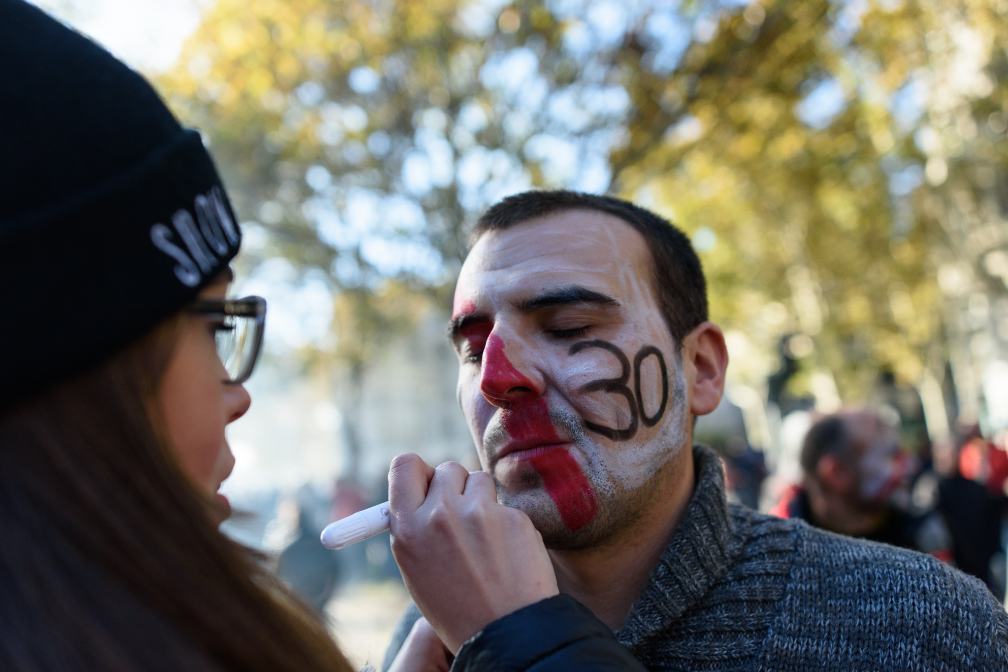 Una mujer pinta a su acompañante con los colores del taxi de Madrid y los números 1/30.