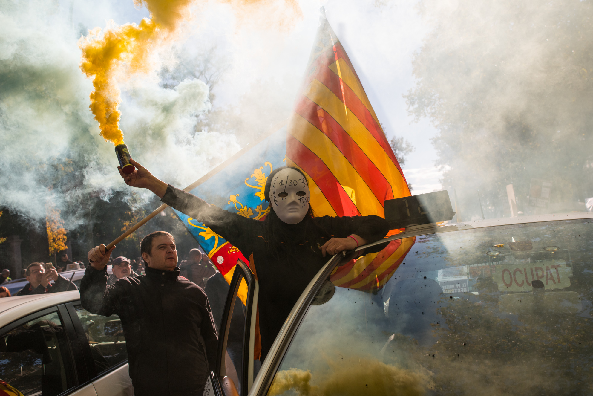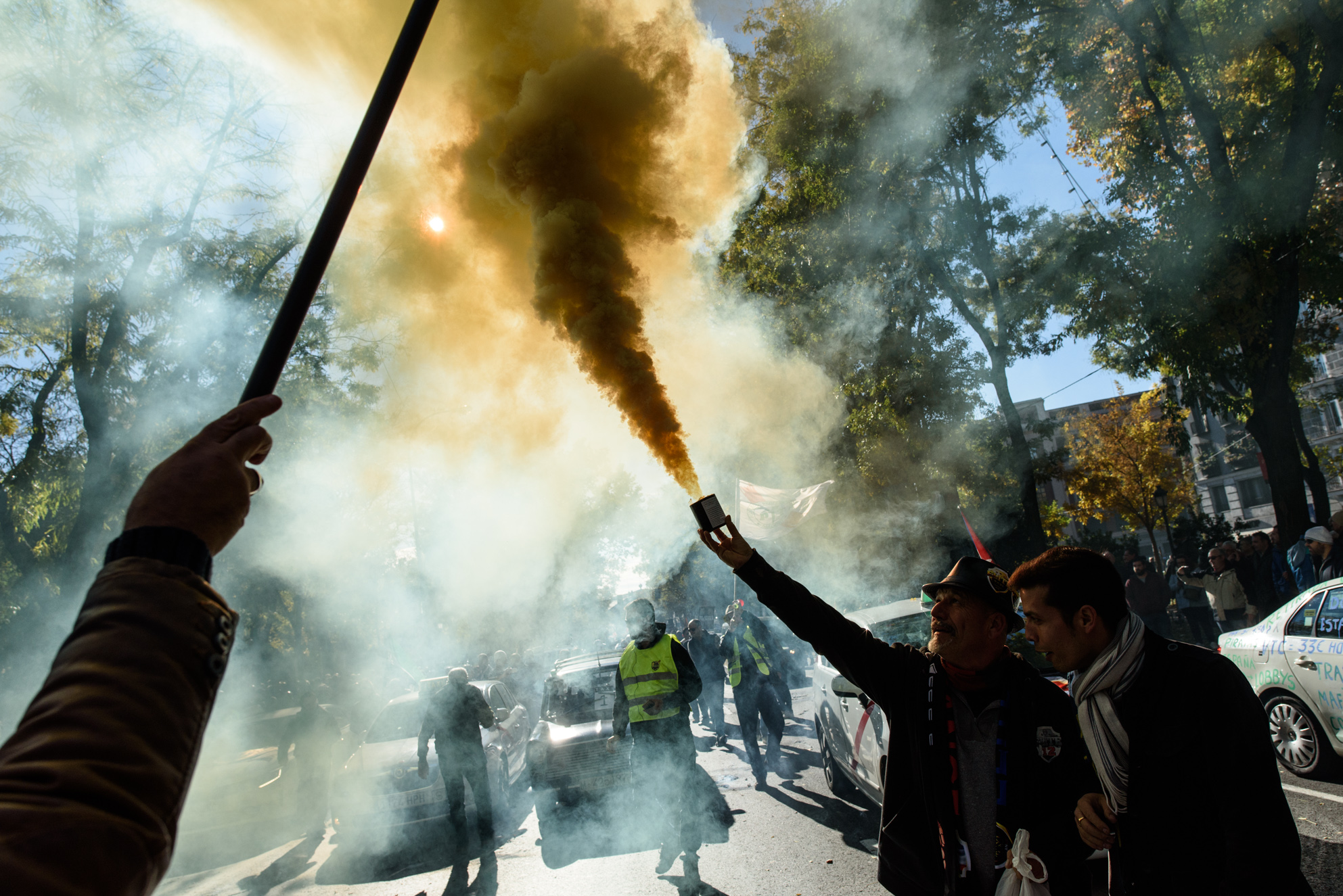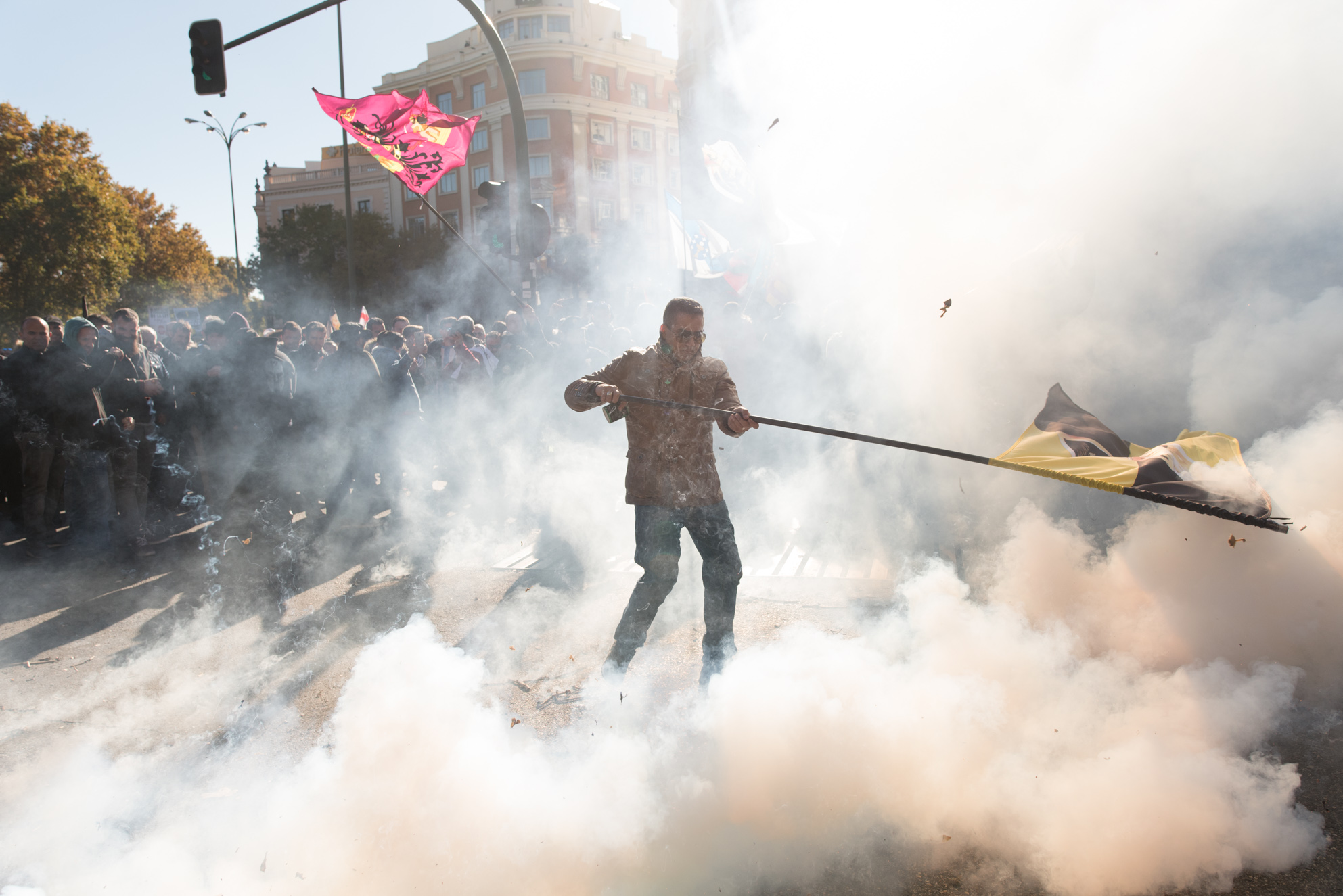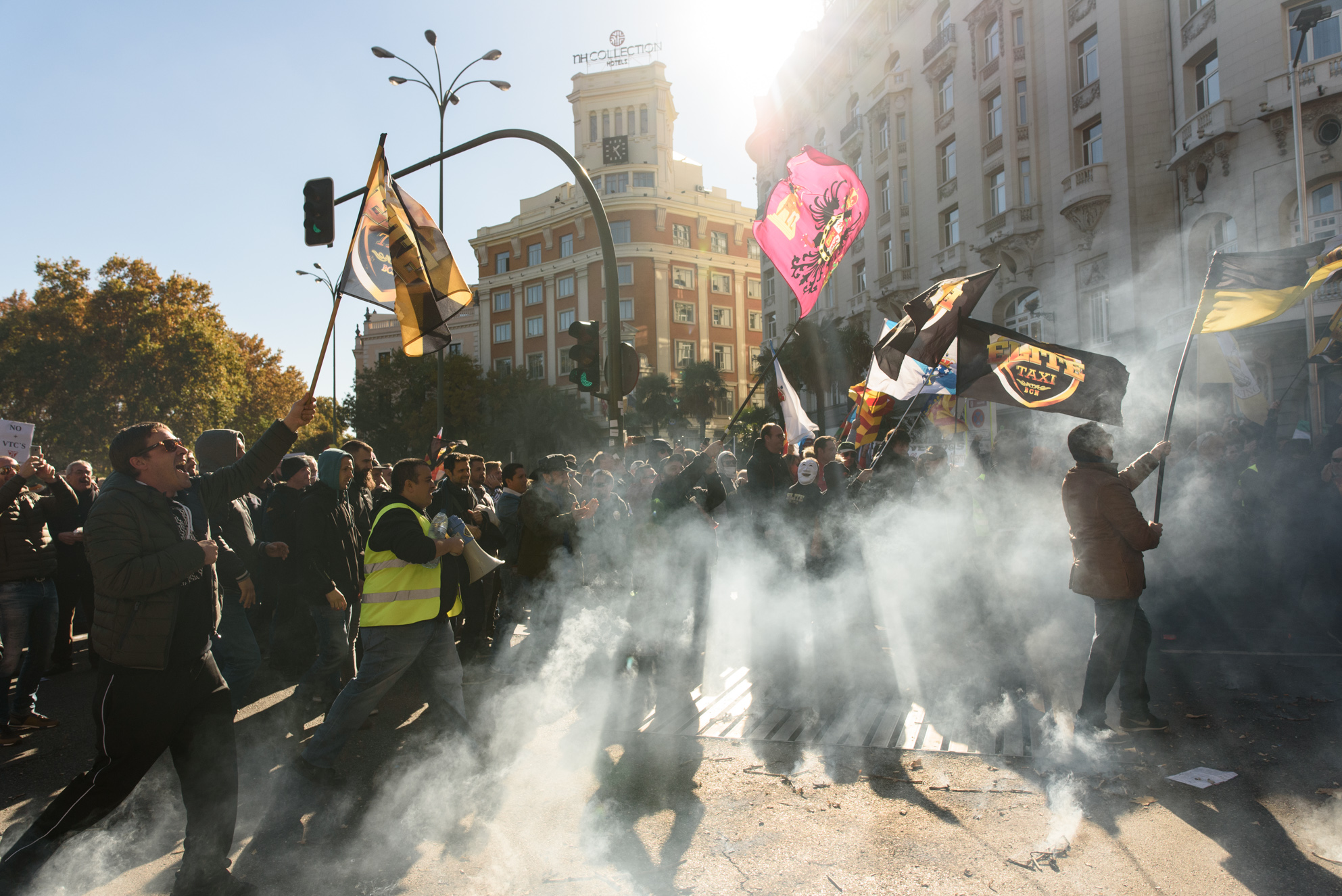 Una taxista portando un bote de humo y subida en su vehículo se manifiesta en Madrid contra Uber y Cabify.