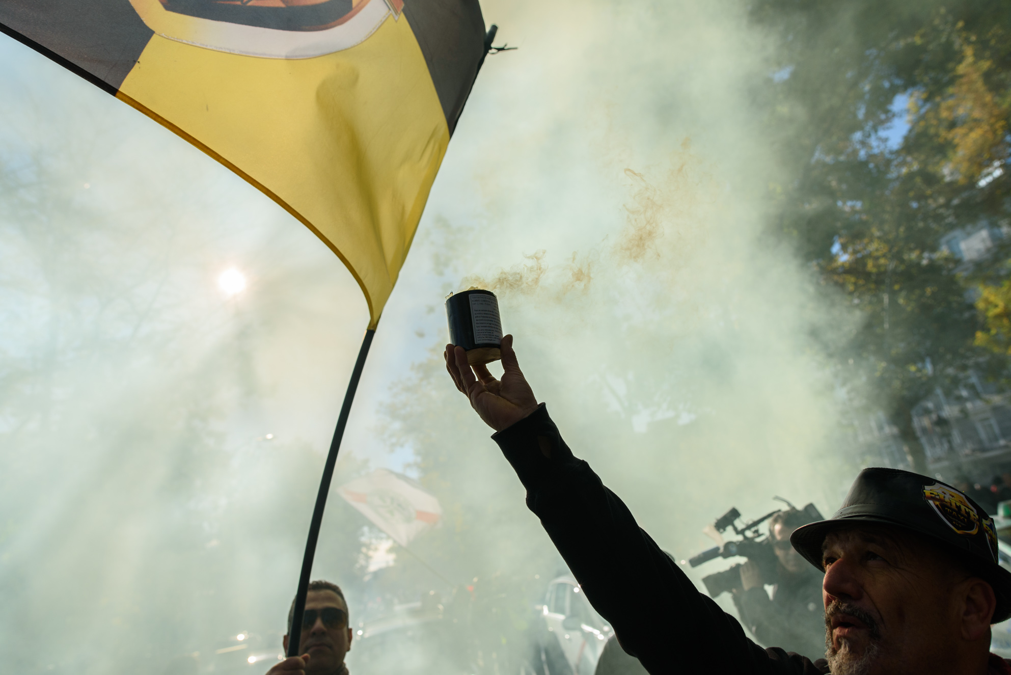 Un manifestante exaltado grita consignas en la manifestación de taxistas.