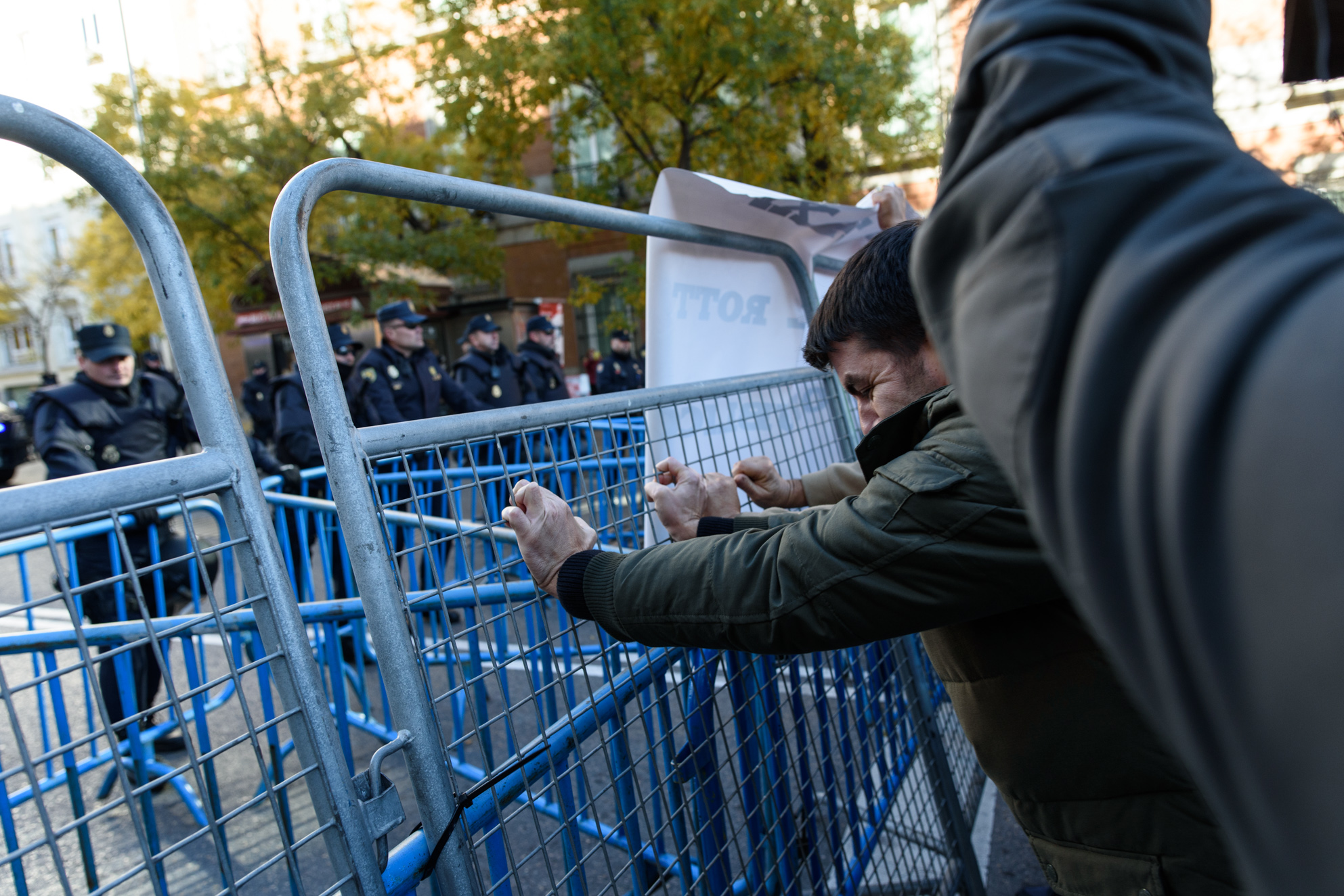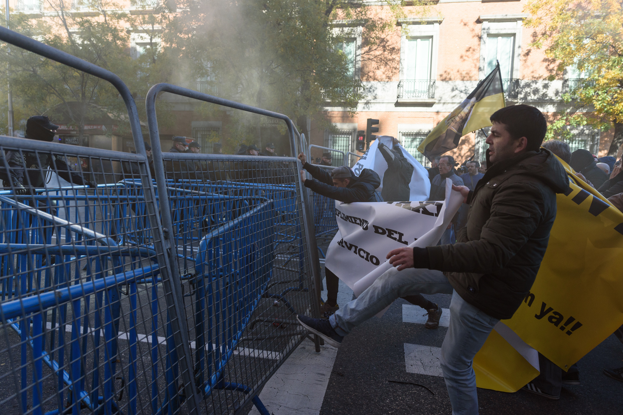 Taxistas intentando derribar las vallas en las cercanías del Congreso de los Diputados.