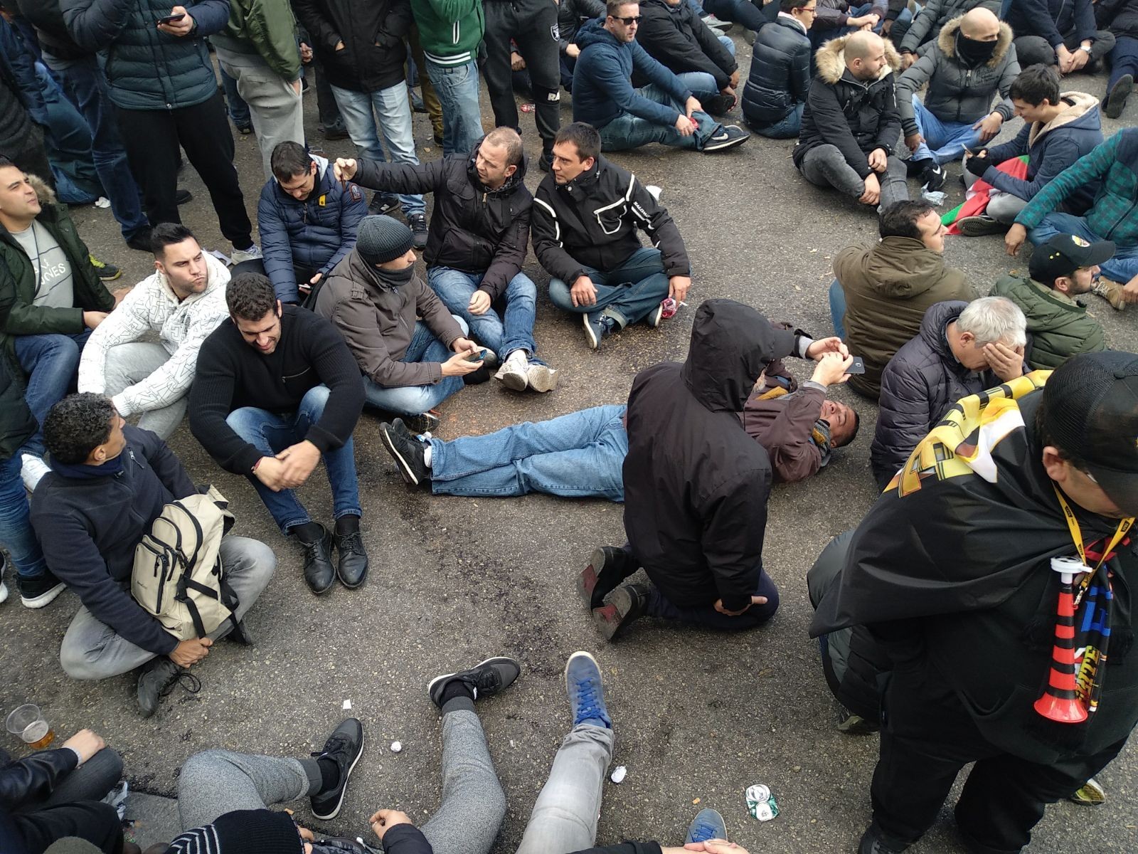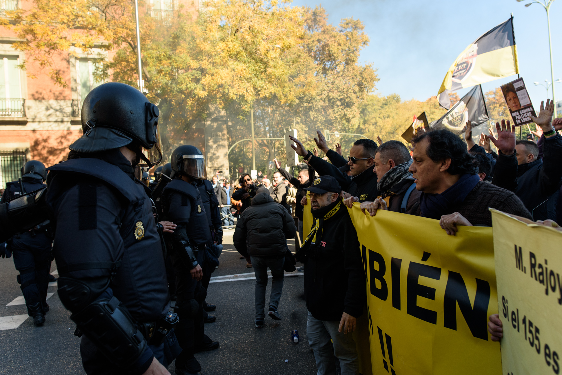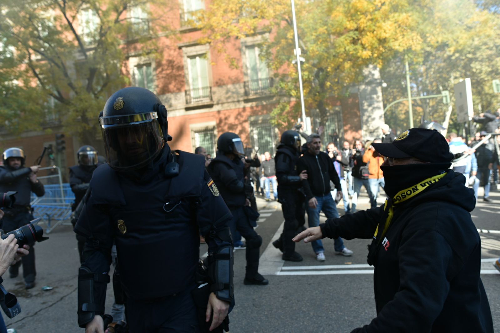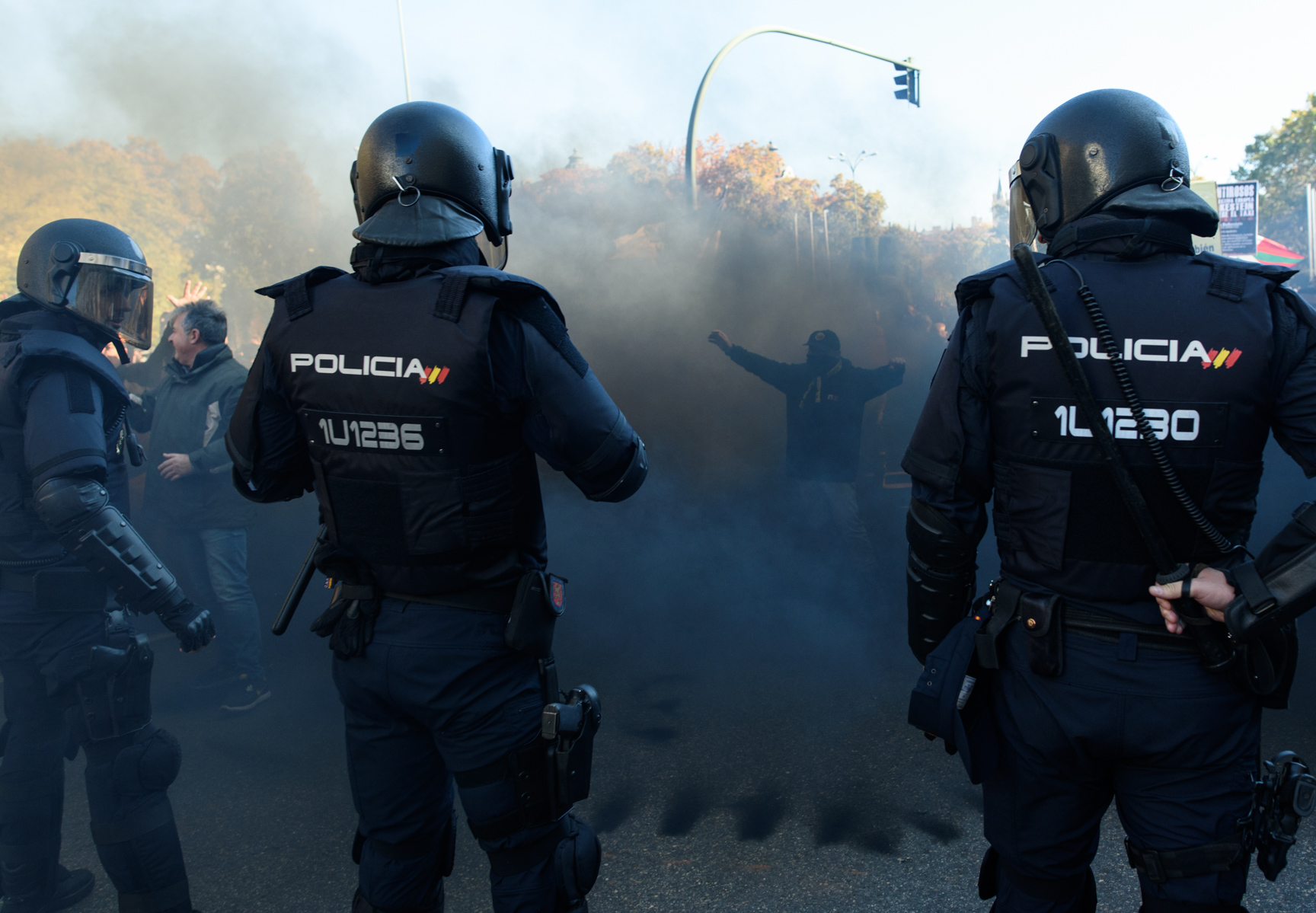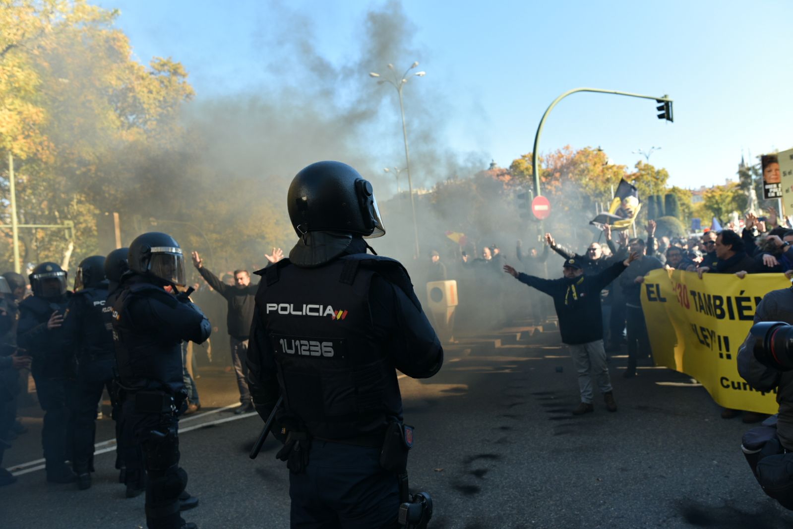 Momentos de tensión cuando la Policía Nacional ha salido del recinto protegido obligando a los manifestantes a retrasar su posición.