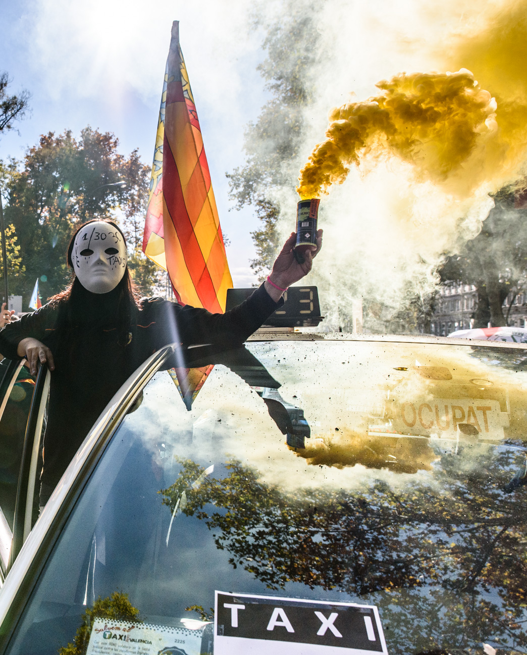 Profesionales del taxi de todo el país se han congregado en Madrid para respaldar la manifestación, donde se aprecian taxis negros y amarillo de Barcelona y con banderas de distintas asociaciones de taxistas y municipios y comunidades de España. Ya en la zona de manifestación a pie se puede ver a cientos de taxistas, algunos con chalecos reflectantes y ocultos por el humo de los petardos. En esta sección es donde mas pancartas y banderas se observan,como la que porta una comitiva de la Federación Cantábrica del Taxi o la de una decena de miembros de la Asociación de taxistas pakistanies de Catalunya PAK Taxi.