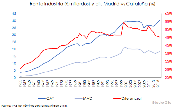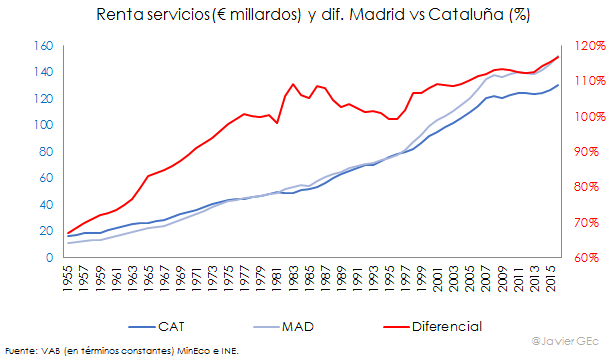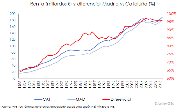 Cataluña ha sido, históricamente, la principal comunidad autónoma por nivel de renta. Sin embargo, en los últimos años Madrid se está acercando cada vez más. Según la base de datos del Ministerio de Economía, el valor añadido bruto (VAB) en términos constantes de Madrid -descontando la inflación- ha pasado del 72% en 1965 al 83% en 1980 y al 96% del que registra Cataluña en 2016.