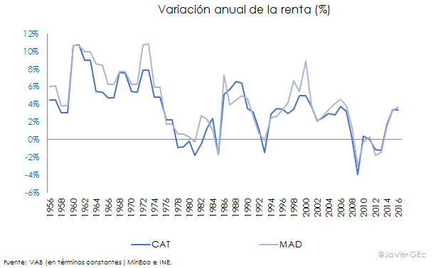 En resumen, en las últimas seis décadas, el crecimiento de Madrid ha superado al de Cataluña hasta situar su renta apenas un 4% por debajo. Como se puede observar en el siguiente gráfico, en los diez años más recientes, la evolución de ambas economías está bastante sincronizada, exceptuando el mayor impacto que tuvo el inicio de la crisis en Cataluña. Sin embargo, esta sincronización podría romperse si la crisis política catalana se prolonga. En ese escenario, sería previsible que Madrid superara a Cataluña, convirtiéndose así en la principal región de España.