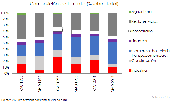Sin embargo, sí que es más relevante comparar la renta aislando cambios en las variaciones de los precios, dado que una mayor inflación no supone producir más bienes o servicios, por lo que tomar como referencia el VAB en términos constantes es más correcto. La economía catalana se caracteriza por un mayor peso de la industria y la construcción, mientras que los servicios tienen una mayor relevancia en Madrid.