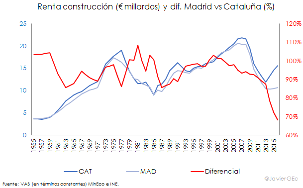 En lo que respecta a la construcción, su renta en Cataluña o ha crecido más o ha caído menos que en Madrid desde el inicio del presente siglo. Destaca especialmente su rebote en los tres últimos años, cuando apenas se observa recuperación en Madrid. El repunte desde 2013 de la construcción en Cataluña es significativo, dado que, en su ausencia, la renta catalana ya sería inferior a la de Madrid.