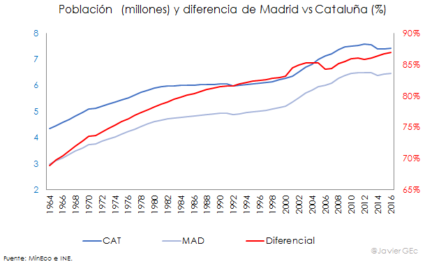 Por otro lado, el crecimiento demográfico en Madrid también ha sido superior al de Cataluña, si bien con un diferencial inferior al de la renta. En 1964, la población madrileña suponía el 69% de la catalana, en 1980 el 78% y en 2016 el 87%.