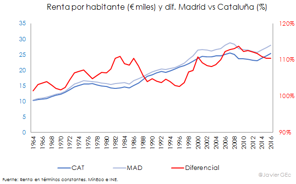 Asimismo, si bien Cataluña tiene más población que Madrid, su renta por habitante ha sido históricamente inferior. El diferencial pasó del 1% en 1964 al 11% en 1983, para descender luego al 3% en 1996 -por el boom turístico de esa época- y, posteriormente, volver a crecer hasta el 14% en 2009, en pleno inicio de la crisis. Desde entonces, se ha reducido hasta el 10% actual.