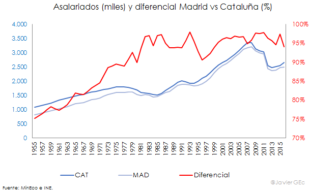 En cuanto al empleo, la evolución relativa de los asalariados según la Encuesta de Población Activa (EPA) es algo errática y refleja dos fases: la primera, de mejor evolución en Madrid, desde 1955 hasta 1983, cuando el diferencial paso del 75% al 97%, y una segunda de estabilización, donde el diferencial de Madrid se sitúa entre el 91% y el 98% de Cataluña.