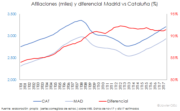Asimismo, las afiliaciones a la Seguridad Social, menos volátil que la EPA, muestran un mayor crecimiento relativo de Madrid desde 2001 hasta finales de 2012 para, desde entonces, estabilizarse o incluso revertirse ligeramente, situándose hoy en el 91%.