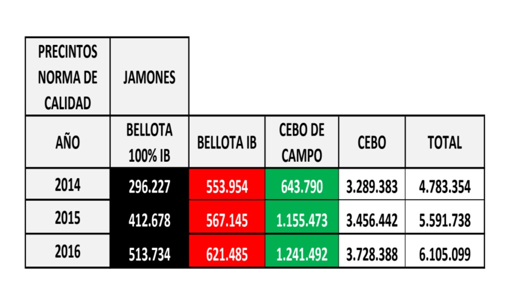"Son Ibéricos los Jamones que llevan alguno de estos cuatro precintos de Norma, no hay lugar para la duda y mucho menos para el fraude. El precinto debe ser de uno de estos cuatro colores", insisten. Más de la mitad de los jamones de 2016 eran de Cebo Ibérico.