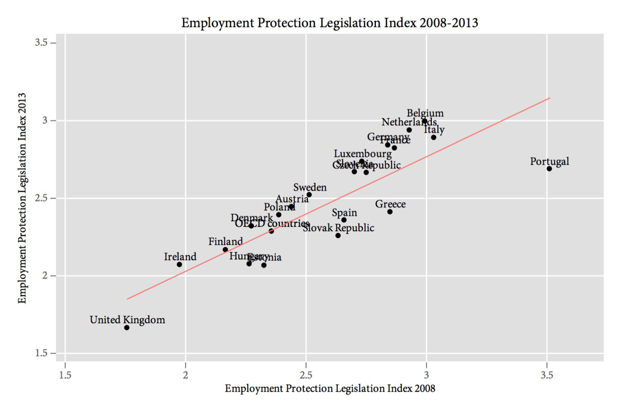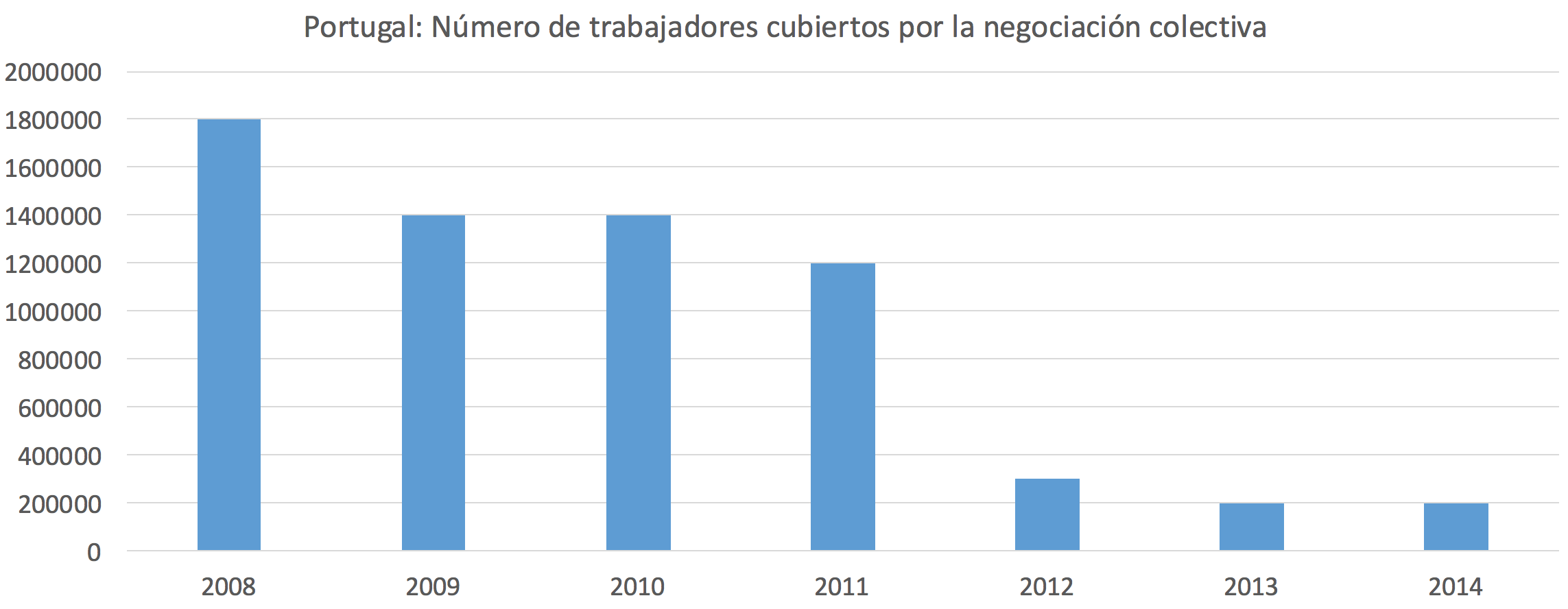 El socialista José Sócrates, primero, y el conservador Passos Coelho, después, siguieron las recomendaciones de la Troika y recortaron la indemnización por despido de 22 a 14 semanas y congelaron el salario mínimo en 565 euros. Según los indicadores de la OCDE, el grado de proteccionismo laboral bajó un 23% desde el estallido de la crisis hasta el año 2013.