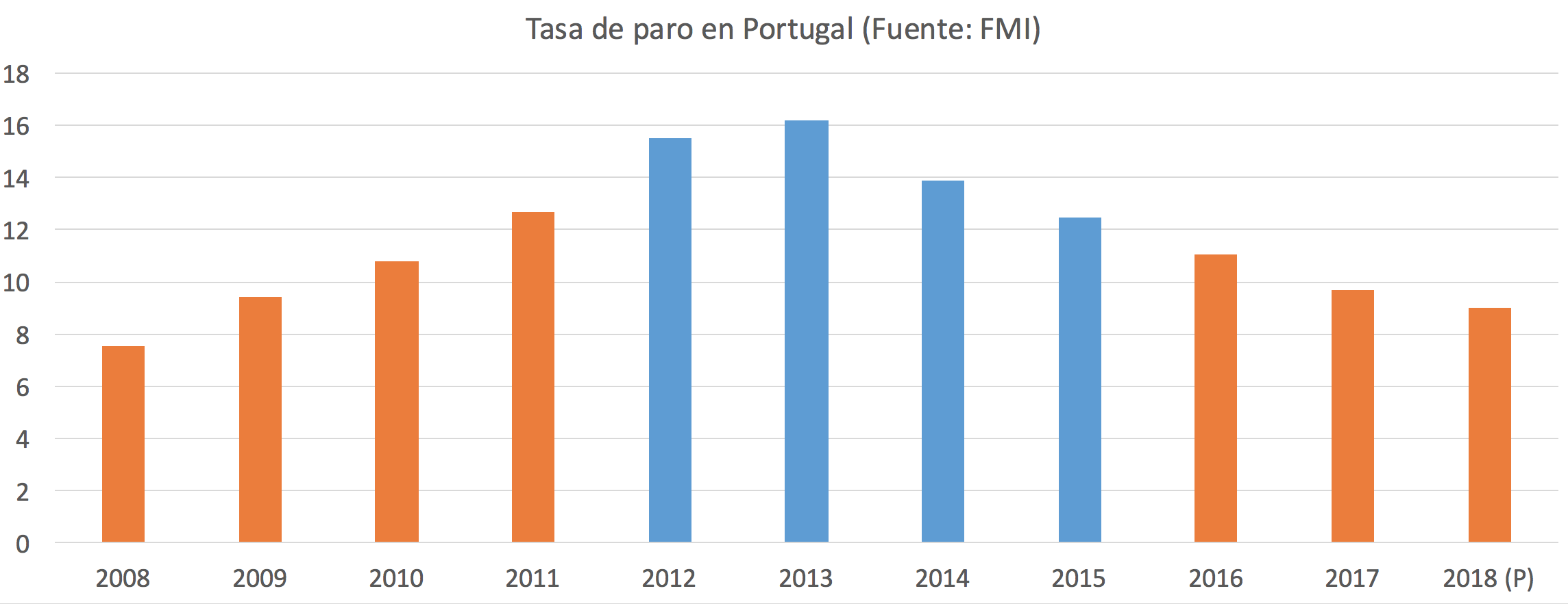 En este primer análisis de las medidas adoptadas por nuestro país vecino, tocaremos el caso del mercado laboral. Se ha hablado mucho de la creación de empleo registrada durante el último ejercicio, pero lo cierto es que la tasa de paro tocó techo en 2013, cuando llegó al 16%, y estaba reduciéndose desde entonces. Las reformas laborales que favorecieron la caída del desempleo fueron introducidas bajo supervisión de las autoridades europeas, en el marco del programa de "rescate" que evitó la quiebra de Portugal.