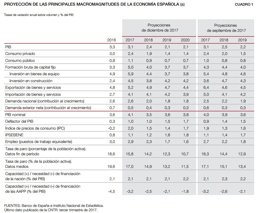 De esta manera, el cuadro macro del Banco de España (ver imagen inferior) plantea un crecimiento superior al 2% de aquí a 2020, con una tasa de paro que cae de forma constante hasta las cercanías del 10% (sigue por encima del 15%) y con un patrón de crecimiento interesante, más diversificado que en otras épocas de expansión y buenas cifras en exportaciones o inversión en bienes de equipo, con superávit de la balanza por cuenta corriente (es decir, no necesitamos crédito y estamos financiando al exterior). Sólo el déficit de las cuentas públicas, que no se cerrará ni siquiera tras 8 años de crecimiento, aparece como una sombra preocupante en el horizonte.