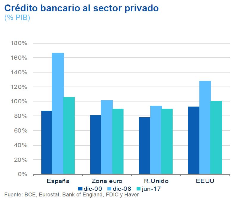 Como vemos en el gráfico, el saldo deudor de las familias y empresas con las instituciones financieras es mucho más reducido, en términos de PIB, que en 2007. Durante la burbuja nos endeudamos como pocos. Pero también hemos sabido cambiar esa tendencia con más rapidez que en otros lugares.