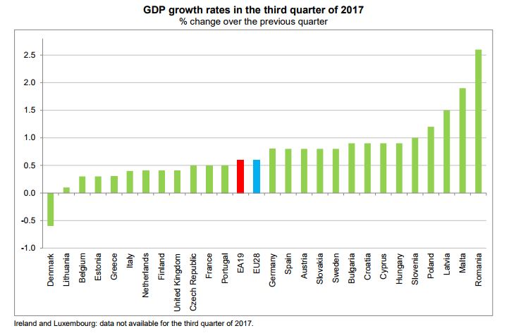 Por eso nos interesa, y mucho, que a nuestros vecinos les vaya bien (y nos deberían poner nerviosos noticias como las del Brexit). Y en este final de 2017, casi todas las cifras son positivas también en este terreno. Como podemos ver en el siguiente gráfico de Eurostat, con los datos de crecimiento del PIB en el último trimestre, la UE vive una etapa de clara recuperación. No sólo los datos trimestrales son buenos. En tasa interanual, la Eurozona crece al 2,6%, la UE también al 2,6%, Alemania al 2,8%, Francia al 2,2%, Reino Unido al 1,5% (el peor dato entre nuestros principales mercados) y Portugal al 2,5%. Dos apuntes: España sigue estando a la cabeza de las grandes economías de la UE y el viento de cola (coyuntura internacional) parece que seguirá ayudando. Los PMI (un indicador adelantado basado en las decisiones de inversión-pedidos-compras que están haciendo las empresas) apuntan a un crecimiento sostenido del 2,5-3,0% de la Eurozona en los próximos dos años.