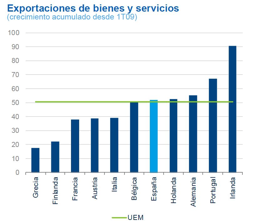 El gráfico muestra el crecimiento de las exportaciones en los últimos años, que ha estado por encima de la media de la UE y de países de un tamaño similar como Francia o Italia. Se ha hablado mucho de esta novedad (la salida al exterior, en busca de esos clientes que la crisis se llevó del interior) y es cierta. Pero además, va acompañada de buenas noticias: por ejemplo, según los datos de BBVA Research, "hasta un 75% del crecimiento de las exportaciones de bienes se explica por una mayor diversificación geográfica". No sólo eso: en otras ocasiones en las que la crisis ha empujado a las empresas españolas a exportar, esta tendencia se ha revertido cuando la demanda interna se ha recuperado. Ya no. En los últimos tres años, la recuperación del consumo nacional "no ha contribuido a reducir el crecimiento de las exportaciones".