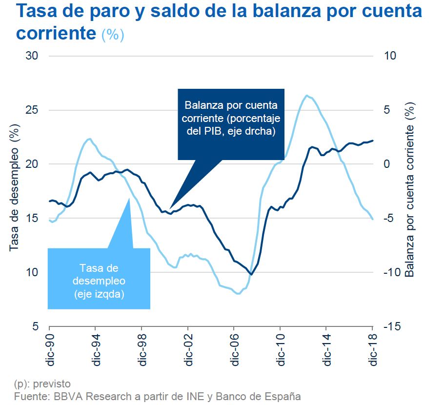 Por eso es tan positivo lo que se intuye a partir de 2013-14. La tasa de desempleo comienza a bajar (y con fuerza) pero el superávit por cuenta corriente se mantiene. No es una cuestión menor. Quiere decir que estamos creciendo sin la respiración asistida del crédito. Es más, incluso aunque las administraciones públicas mantiene su déficit por encima del 3% del PIB, el Banco de España calcula que el conjunto del país podrá mantener un superávit con el exterior del 2,1% este año (y pronostica una cifra similar de aquí a 2020). Son datos alentadores y que también dan margen para afrontar la próxima crisis. No es lo mismo, ni mucho menos, que la recesión te llegue con un saldo negativo de 10 puntos (como llegamos a rozar en 2007) a que te encuentre con 2 puntos de superávit. [Dicho esto, como apunta el Banco de España en este informe, uno de los principales riesgos de nuestra economía es que la posición deudora neta con el exterior sigue en el 85,7% del PIB, entre los más elevados de las economías ricas, a consecuencia de que se haya disparado la deuda pública desde 2008].