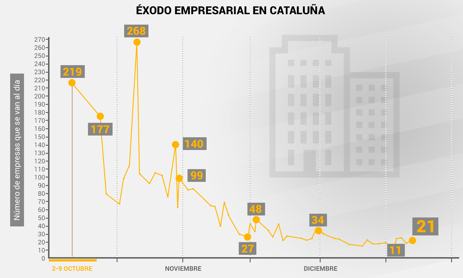 Fue en el décimo mes del año, tras el referéndum ilegal del 1-O, cuando cundió el pánico empresarial. Los días con el mayor número de traslados de sedes fueron el pasado 19 de octubre (con 268 compañías que se marcharon de la región) el 9 de octubre (con 212 entidades salientes) y el día 10 de octubre (con 177 empresas menos). Ya en el mes de diciembre, la fuga se ha ralentizado, y se marchan cerca de unas veinte empresas diarias. El pasado día 1 de diciembre se produjo el punto máximo del mes, con 31 empresas menos, y el día 18, el mínimo, cuando solo se marcharon 11 firmas.