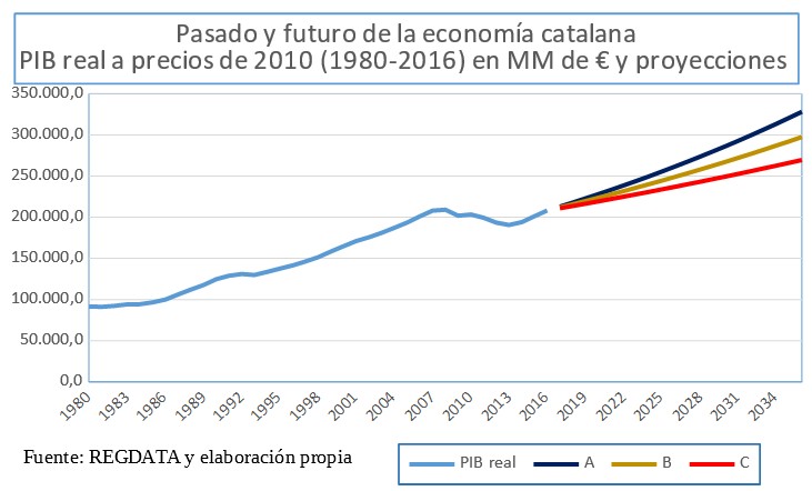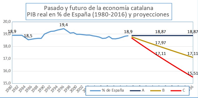 Reitero por otra parte que, desde 1980 -o sea, con la autonomía-, Cataluña creció de la misma manera que el conjunto de España, manteniendo así a lo largo del tiempo, con muy pocas variaciones, su participación del 18,9 por ciento en el PIB español. No es un pasado muy brillante si tenemos en cuenta que hay otra región española de alto nivel de renta -la Comunidad de Madrid- que en el mismo período lo hizo al 2,7 por ciento anual, desplazando a Cataluña de la primera posición dentro de España, en cuanto al tamaño del PIB, desde el año 2012.