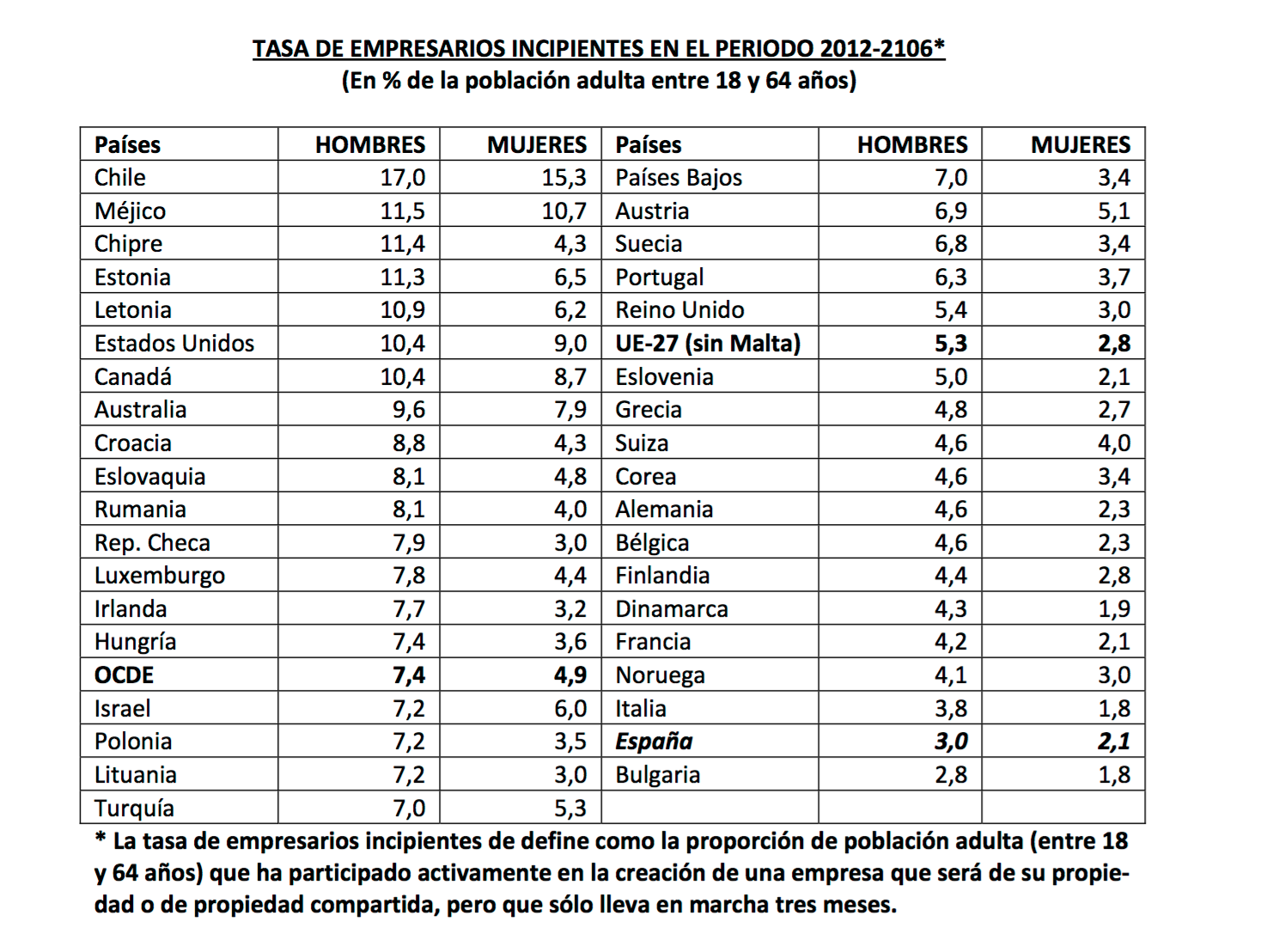 Uno de los indicadores que toma como referencia la OCDE es la tasa de empresarios incipientes, un indicador que mide la proporción de la población en edad de trabajar que ha participado activamente en la creación de una empresa de nuevo cuño. En Europa, este indicador alcanza el 5,3% entre la población masculina y el 2,8% entre la femenina.