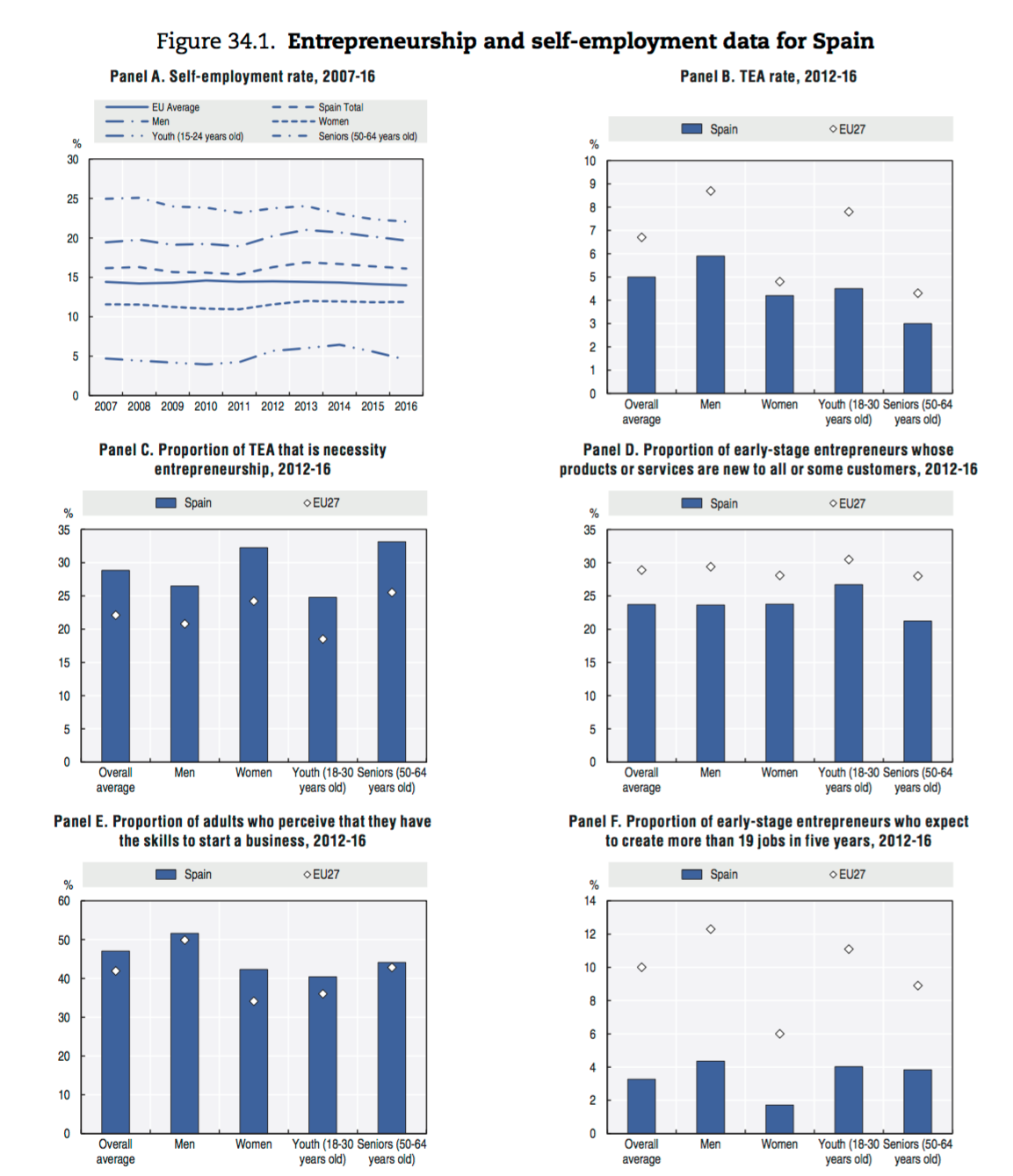 El informe de la organización sí destaca como un paso adelante las nuevas medidas de apoyo a los emprendedores, impulsada en el marco del acuerdo de gobierno entre PP y Ciudadanos. Por otro lado, el estudio va más allá de la creación de nuevas sociedades y echa un vistazo a las cifras globales de autoempleo. En este indicador, España sí se sitúa por encima del promedio de la UE: 16,1% en nuestro país, 14% en el conjunto de la Unión.