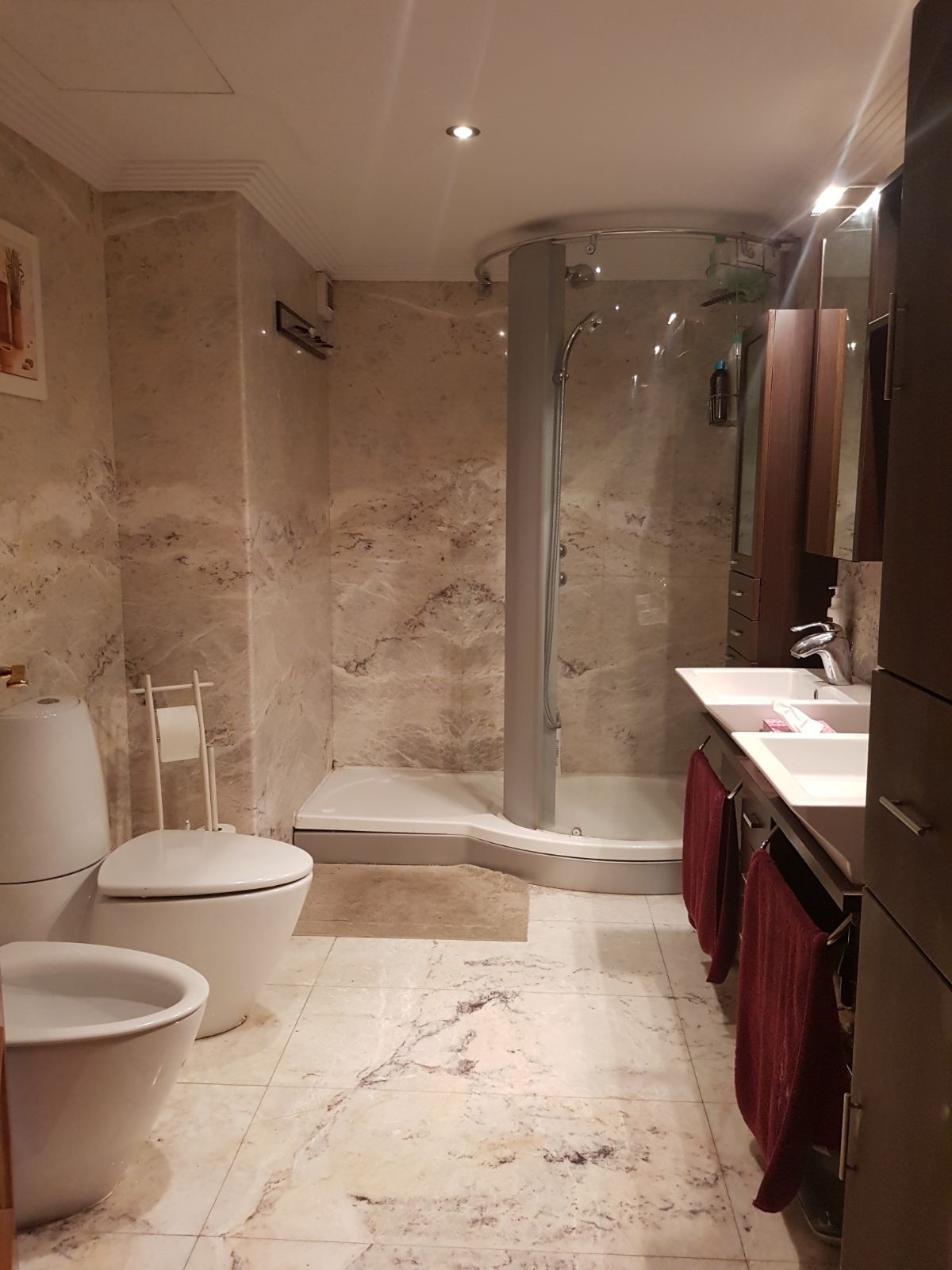 Cuenta con dos baños, uno con bañera de hidromasaje y el otro con ducha hidromasaje