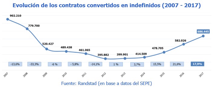 Cuando se analiza la serie histórica, se observa que desde el año 2007, momento en el que se superaron las 900.00 conversiones, el número de este tipo de contratos descendió durante cinco periodos consecutivos hasta registrar la cifra más baja en 2012 (395.882). Pero, desde entonces, las conversiones han aumentado durante cinco años seguidos, registrando el segundo mayor incremento en 2017 (17,9%), sólo superado por el registrado hace un año (21,6%).