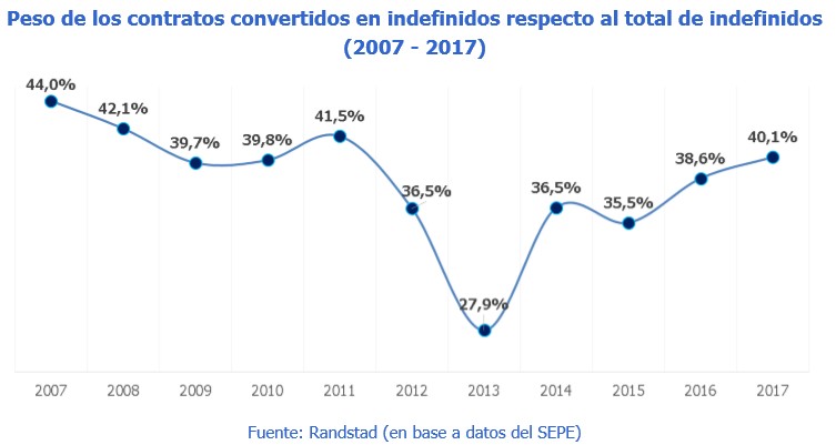 El informe señala que 2017 ha finalizado con el ratio más elevado entre contratos convertidos en indefinidos y el total de indefinidos desde 2011. Es decir, tras registrar datos entre el 39% y el 44% entre los años 2007 y 2011, dicho índice se redujo progresivamente hasta alcanzar su mínimo en 2013, cuando apenas el 28% del total de contratos indefinidos provenía de una conversión. Tras tres años de tasas entre el 35% y el 39% entre 2015 y 2016, 2017 ha vuelto a superar la barrera del 40%.