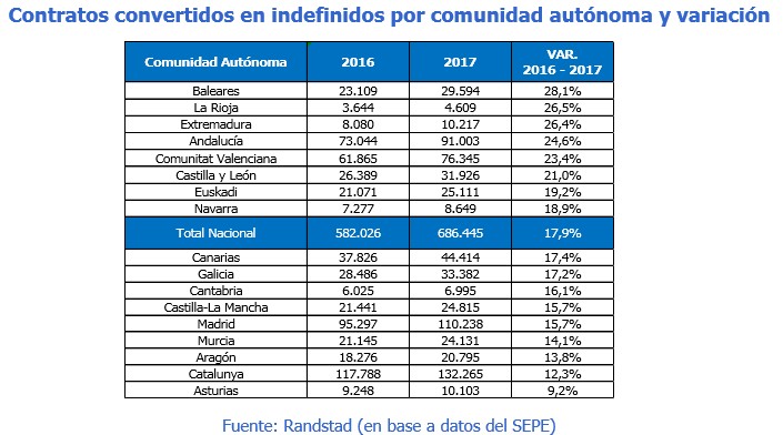 Estos 686.445 contratos temporales convertidos en indefinidos representan el 40,1% del total de contratos indefinidos del año, es decir, casi de la mitad de los contratos indefinidos de 2017 proceden de contratos temporales. "El aumento de contratos temporales convertidos en indefinidos y el acercamiento a las tasas de conversión previas a la crisis confirman la tendencia positiva del mercado laboral y la recuperación económica. De igual modo, se muestra que la contratación temporal funciona como puente a un puesto de trabajo estable. De hecho, para aquellos perfiles con menor cualificación, la contratación temporal les ayuda a aumentar su empleabilidad a través de la experiencia", señala Luis Pérez, director de Relaciones Institucionales de Randstad.