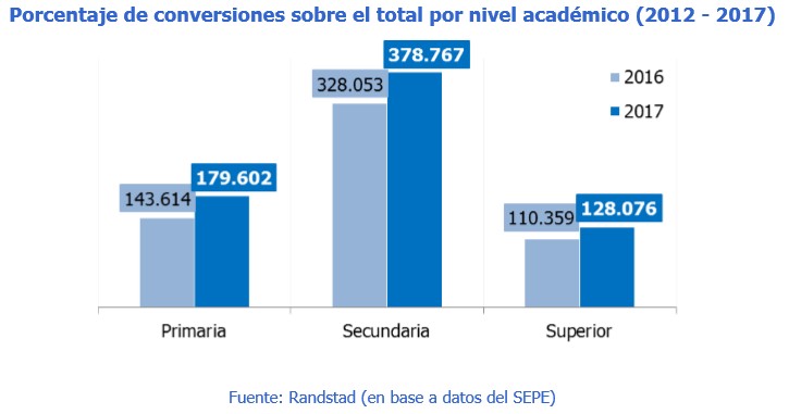 En el caso de trabajadores con estudios primarios, la cifra de conversiones realizadas durante el año pasado es de 179.602, lo que supone un 26,2% del total de conversiones. En este sentido, las conversiones a estos profesionales también encadenan cinco periodos de aumento consecutivo y crecen un 25,1% en el último año.