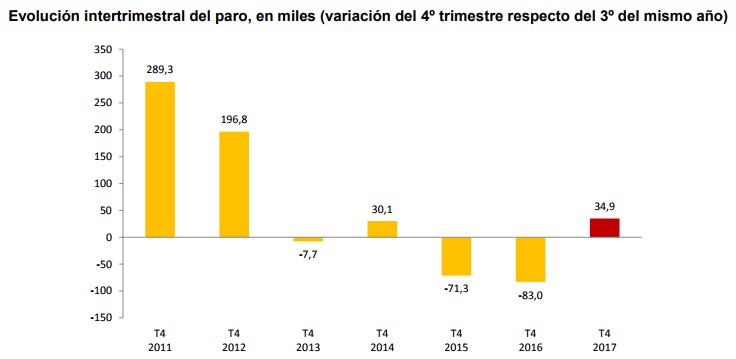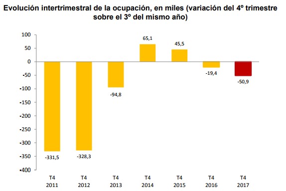 Por un lado, el cuarto trimestre no fue especialmente positivo, ya que el número de ocupados descendió en 50.900 personas (-0,27%), la mayor caída en este período desde 2013.