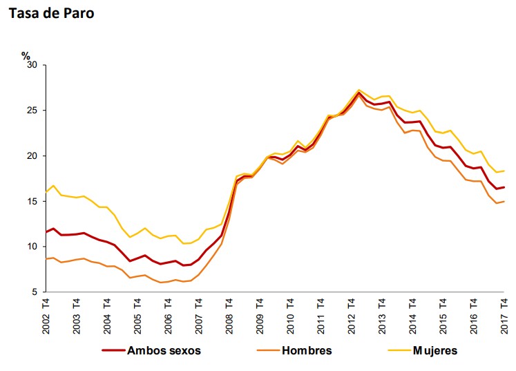 El paro bajó en los Servicios (64.200 menos), la Construcción (-23.600) y la Agricultura (-18.600). En la Industria prácticamente no varió. De este modo, la tasa de desempleo se situó en el 16,55% al cierre del pasado ejercicio, casi 2,1 puntos menos que en 2016 (18,6%) y su nivel más bajo desde 2008 a cierre de año.