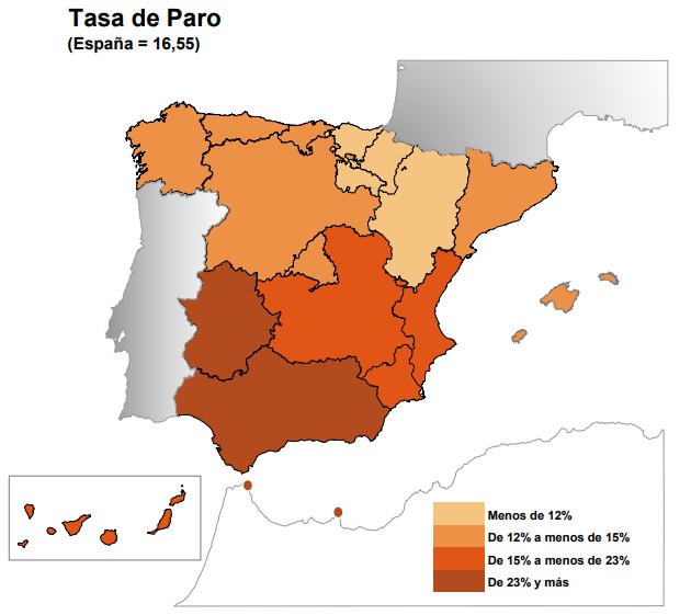 Y en materia de paro, las mayores caídas se registraron en Andalucía (159.700 personas menos), Cataluña (79.200 menos) y Comunidad Valenciana (57.400 menos), mientras que sólo registró un ligero incremento en Cantabria (1.400 más) y La Rioja (1.000 más), así como en la ciudad autónoma de Ceuta (1.700 más). Navarra contabilizó la tasa de paro más baja (9,63 %) y Extremadura, la más alta (25,12 %).