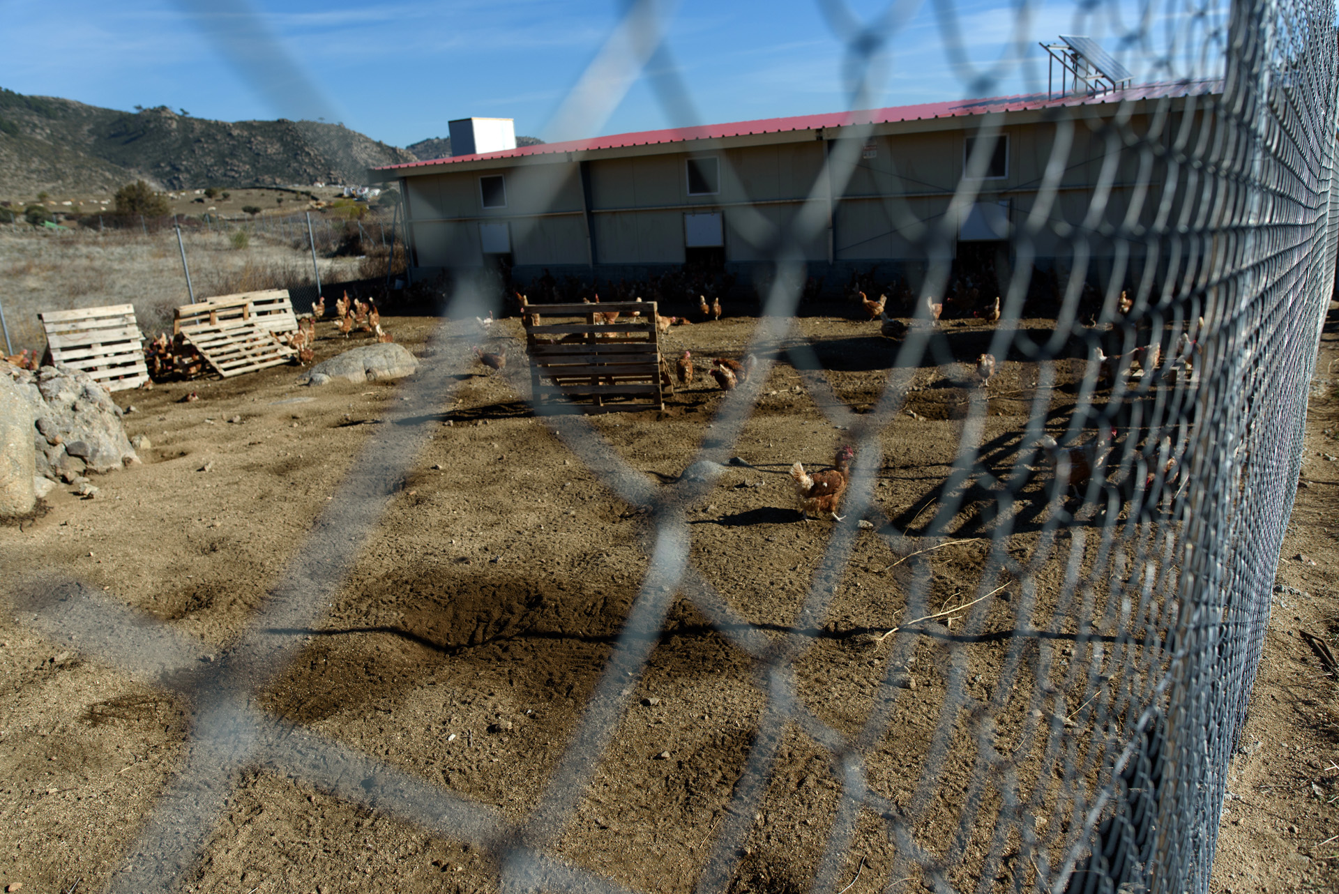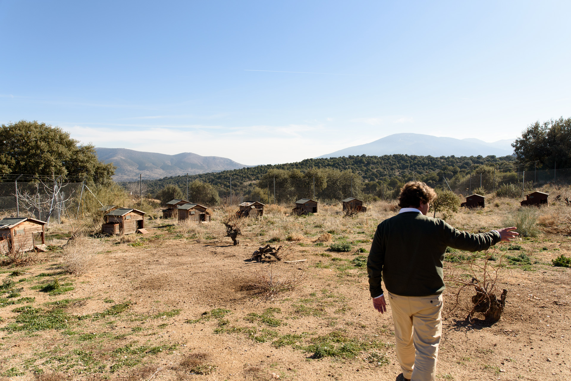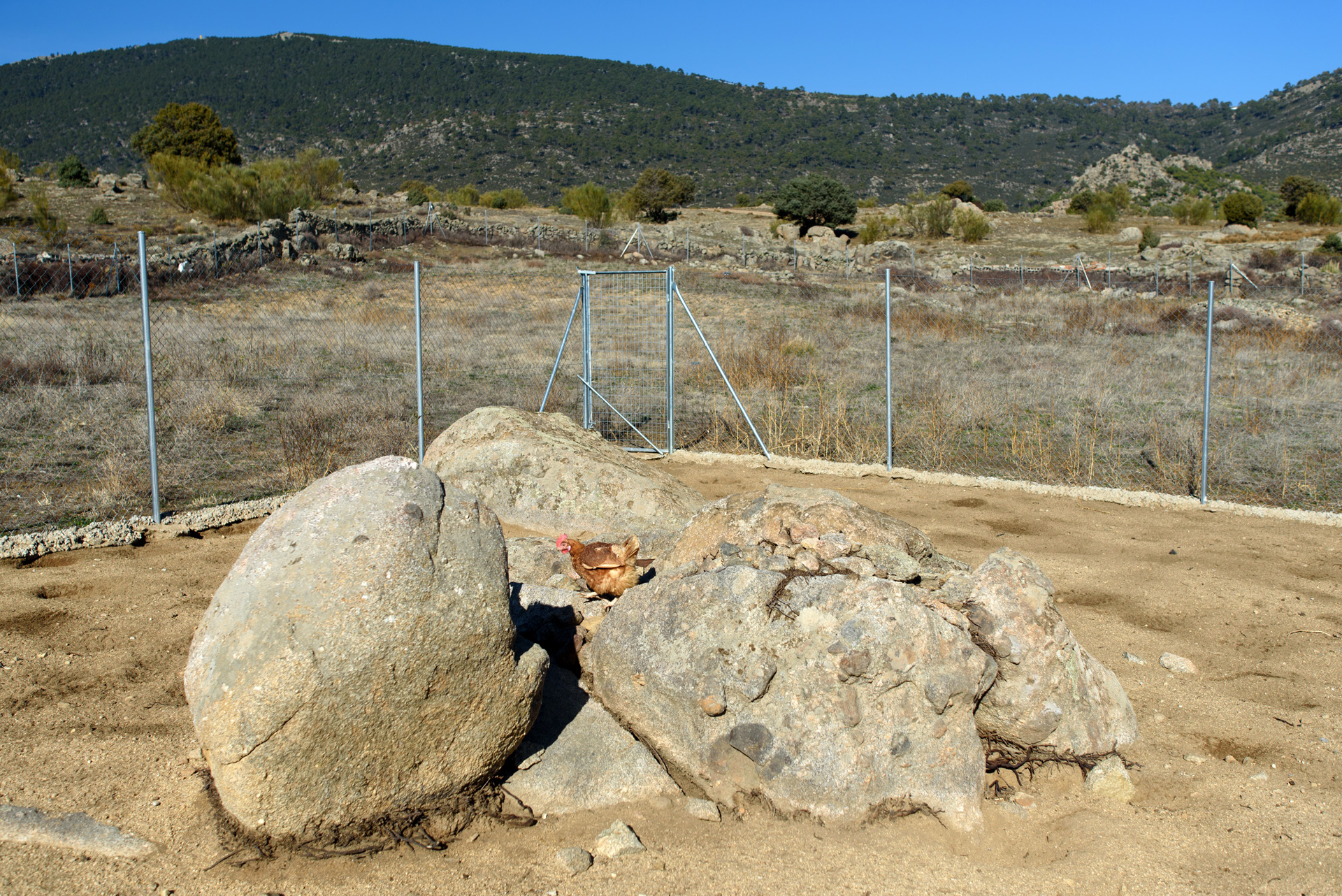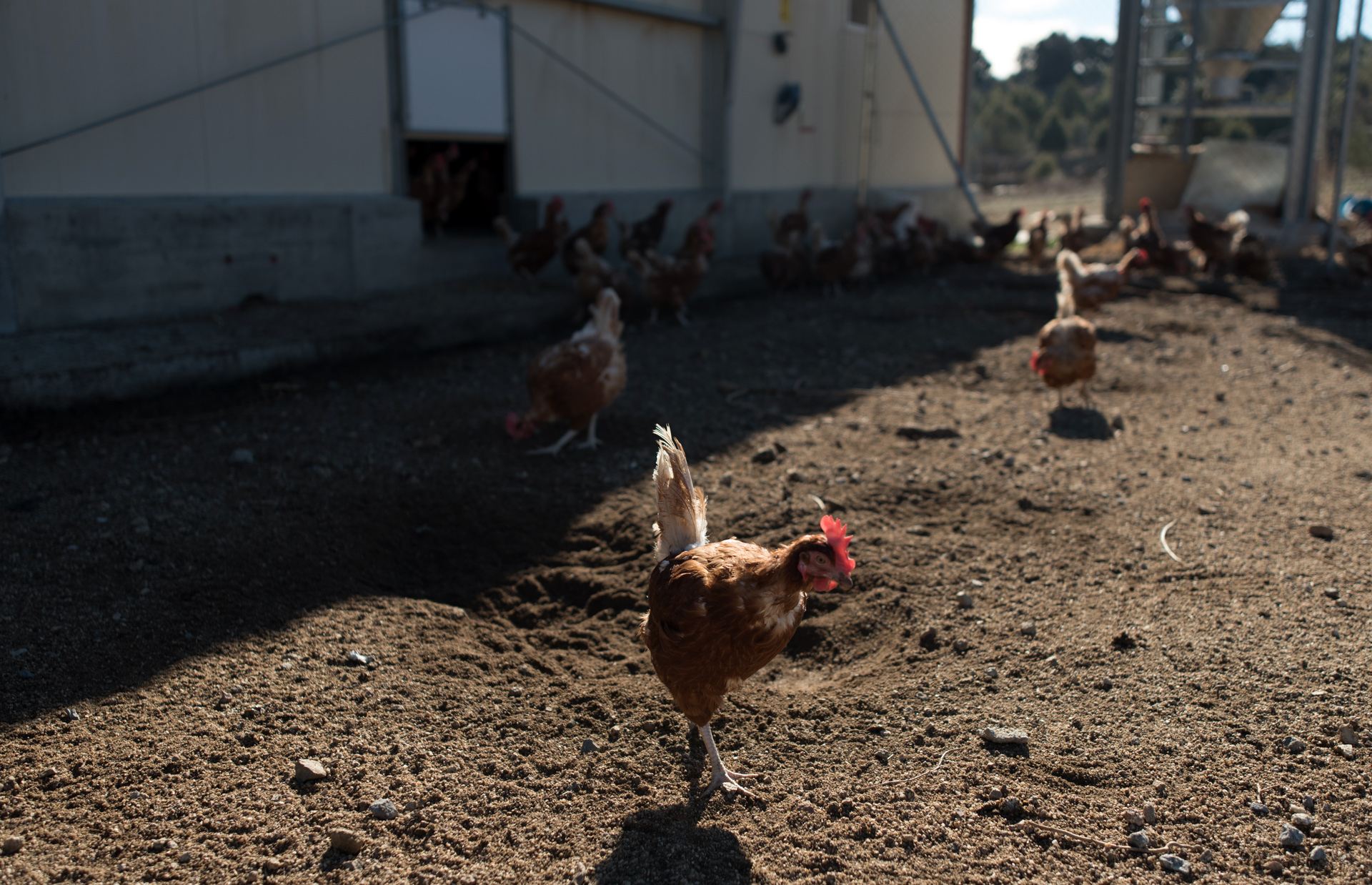 Las gallinas campan a sus anchas con vistas a la sierra, dentro de los límites de un espacio abierto.