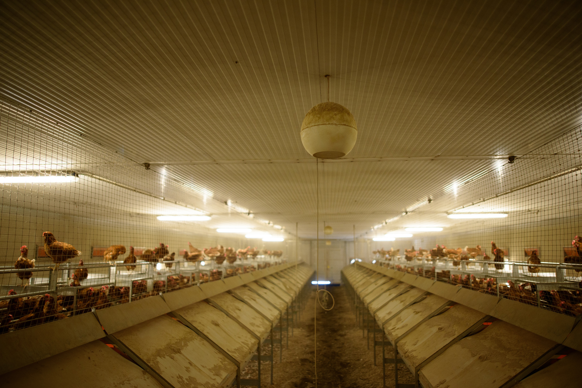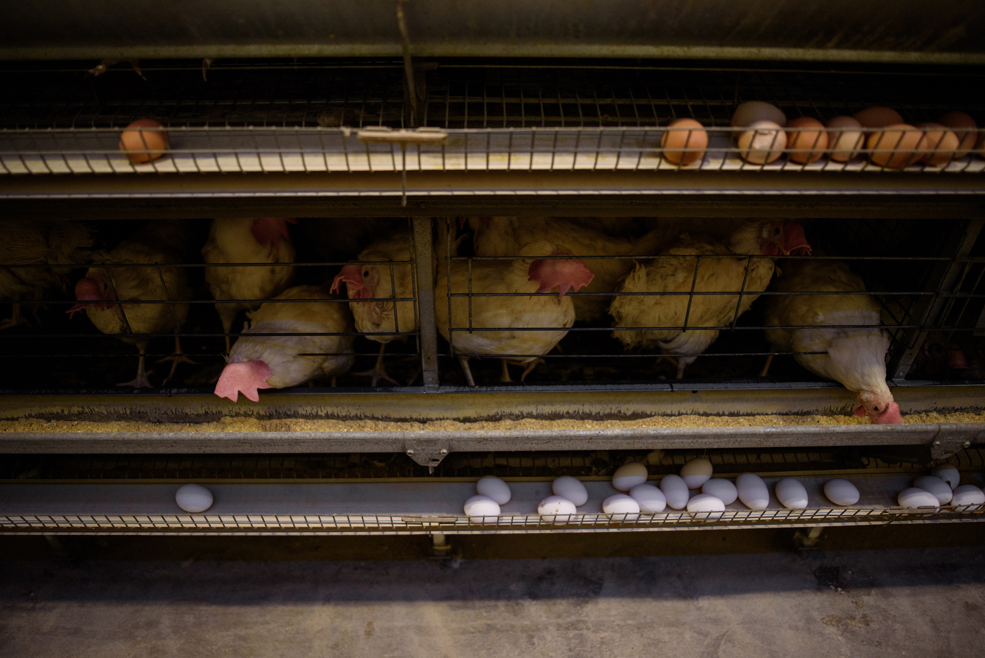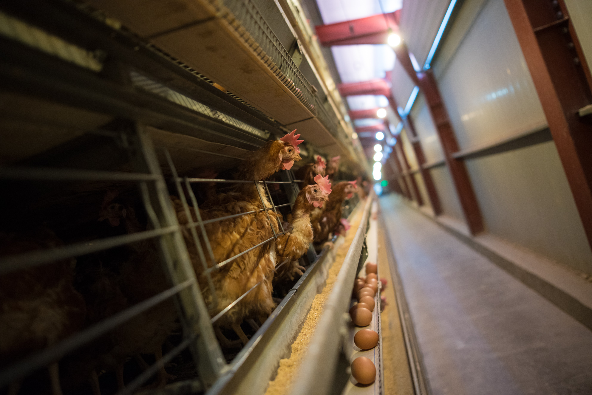 En el interior de una de las naves donde se encuentran las gallinas en jaula y se escucha música a un volumen adecuado.