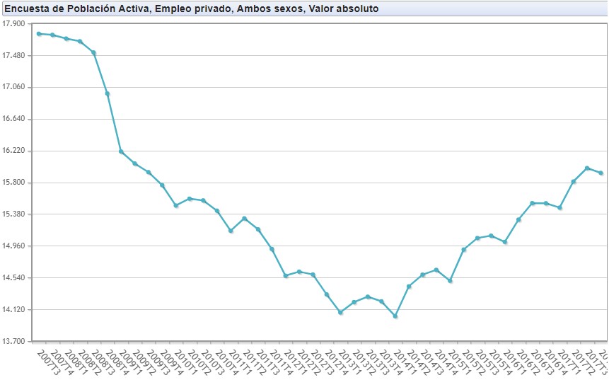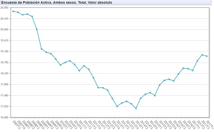 Desde el tercer trimestre de 2007, momento en el que se registró un récord histórico de ocupación, con algo más de 20,7 millones de trabajadores, hasta el principios de 2014, cuando se alcanzó el mínimo, la crisis se llevó por delante 3,8 millones de empleos, siempre tomando como referencia la EPA. Sin embargo, desde ese momento, el país ha recuperado 2,05 millones, el 54% del empleo destruido por la crisis. Faltarían, por tanto, 1,75 millones de puestos para recuperar el nivel de ocupación previo al estallido de la burbuja.