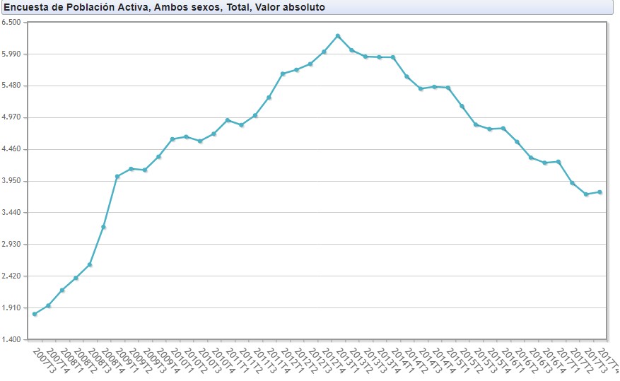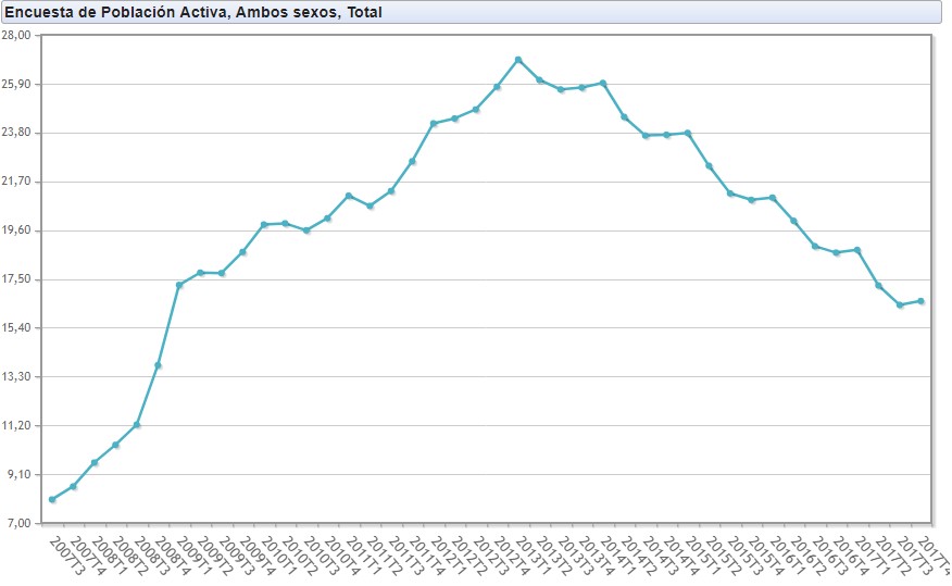Por último, la tasa de paro creció del 8% al 27% hasta principios de 2013, un aumento de 19 puntos porcentuales, tras multiplicarse por más de tres. Desde entonces, ha caído en 10,5 puntos, hasta situarse en el 16,5% a cierre de 2017.
