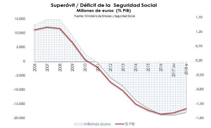Las cifras son las siguientes: el déficit de la Seguridad Social (incluido FOGASA Y SEPE) alcanzó los 16.800 millones de euros en 2017, con lo que se acercará al objetivo fijado en el 1,4 % del PIB. Si sólo miramos a sistema de pensiones, entonces el déficit ha subido hasta los 18.800 millones, un 1,61% del PIB (la previsión era del 1,67%). Para 2018, la previsión de déficit es del 1,47% del PIB para el sistema de pensiones y del 1,1% para todo el sistema de la Seguridad Social.