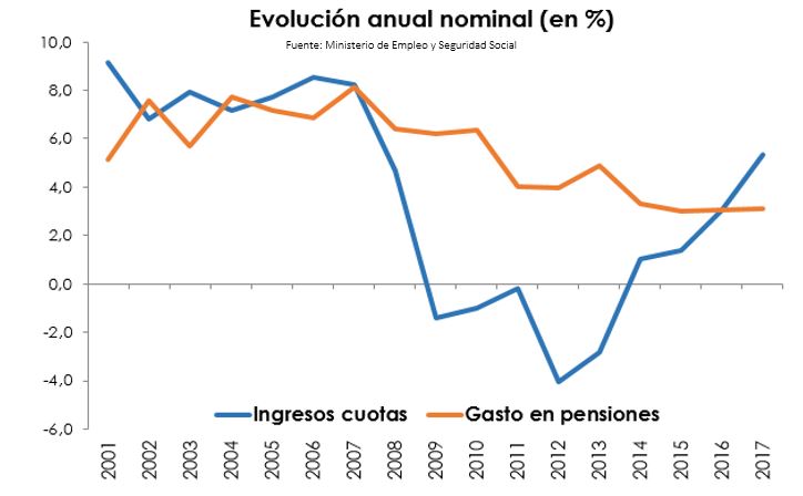 Este miércoles Fátima Báñez acudía a la Comisión del Pacto de Toledo en el Congreso de los Diputados. La ministra comparecía a petición del Grupo Socialista y traía en su cartera una cifra significativa: "Los ingresos por cuotas del sistema de la Seguridad Social subieron en 2017 (5,3%), más que el gasto en pensiones (3%)" [ver gráfico de la presentación de la ministra]. "Es un punto de inflexión", ha dicho, "hemos iniciado el camino de vuelta hacia el equilibrio presupuestario del sistema".