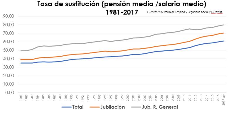 Incluso, si miramos con algo más de perspectiva, el sistema ha ido ganando en generosidad, algo no tan común en otros países europeos. Así, tal y como puede verse en la siguiente gráfica (también de la presentación de la ministra), la relación entre la pensión media y el salario medio está por encima del 80% para las prestaciones de jubilación del Régimen General. En el caso de las nuevas altas, hace un año y medio la propia Báñez situaba la relación entre las nuevas pensiones del Régimen General y el salario medio de la economía española en el 93%.