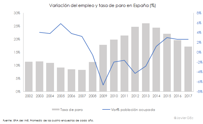El año pasado ha sido un buen año para el empleo. Según los datos de la EPA, en el conjunto de 2017 el empleo creció un 2,7% mientras que la tasa de paro descendió hasta el 16,5%.