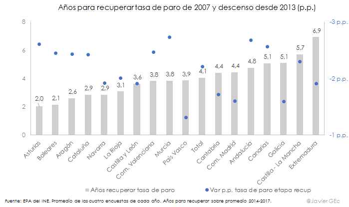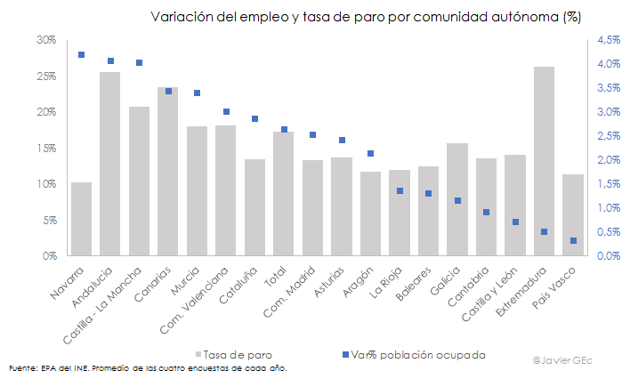 Por comunidades autónomas, el empleo ha crecido especialmente en Navarra, Andalucía y Castilla-La Mancha, con tasas superiores al 4%, con el añadido de que en Navarra la tasa de paro es del 10%, bastante por debajo de la media nacional, al contrario que en Andalucía y Castilla-La Mancha, donde supera el 20%. Por el contrario, 2017 no ha sido tan buen año para Cantabria, Castilla y León, Extremadura y País Vasco, con incrementos del empleo inferiores al 1%. El caso extremeño es, si cabe, mucho más grave, puesto que también sufre una elevada tasa de paro.