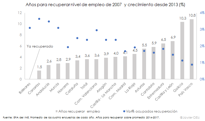 En definitiva, el empleo crece a una diferente velocidad entre las regiones españolas, debido al mayor o menor peso que ostentan algunas actividades más dinámicas, como son el comercio y la hostelería, o el empleo más relacionado con el sector público. En cuanto al paro, resta algo más de tiempo para recuperar los niveles precrisis y las diferencias entre unas y otras regiones se explican, sobre todo, por la evolución del desempleo de larga duración.