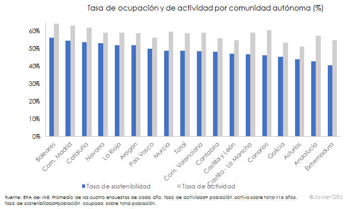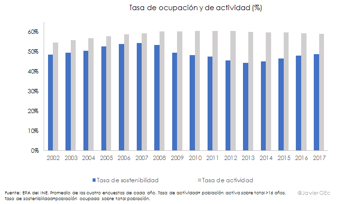 Una positiva consecuencia del incremento laboral es que la proporción de ocupados sobre el total de la población -que puede definirse como "tasa de sostenibilidad"- crece durante los últimos años y ya casi representa la mitad, no muy lejos del máximo del 54% registrado antes de la la crisis. La buena noticia es que crece por la mayor creación de empleo, mientras que la mala es que descienden tanto la tasa de actividad -lo que significa que hay cada vez más jubilados- como la población menor de 16 años, muestra inequívoca del progresivo envejecimiento de la población.
