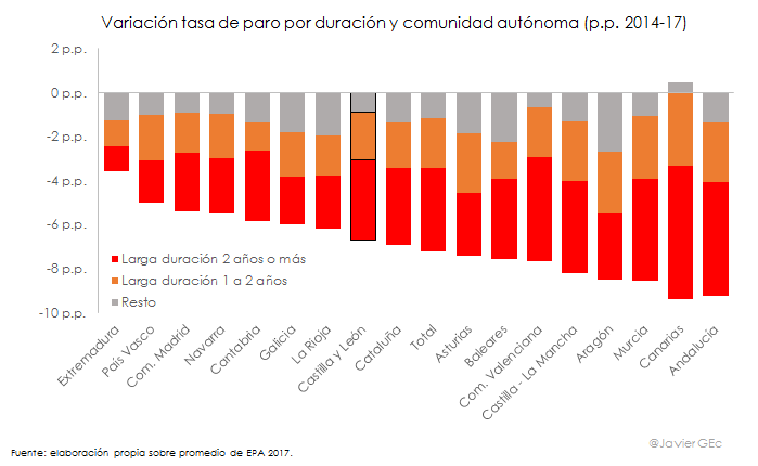 En cuanto al paro de larga duración, que no incluye un componente de paro técnico o friccional como sí tiene el de menor duración, hay diversos factores a analizar, como son el nivel de formación o la movilidad geográfica, que merecen un próximo análisis.