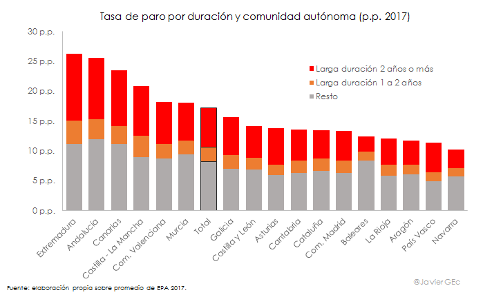 Las diferencias de desempleo en el resto de regiones se encuentran, igualmente, en el paro de larga duración. El paro de menos de un año, pese a suponer la mitad del total, explica, por ejemplo, sólo una tercera parte del diferencial entre Extremadura y Navarra. Si se amplía el ejercicio a las tres regiones con más y menos paro, el diferencial que explica el desempleo de menor duración es algo inferior al 40%.
