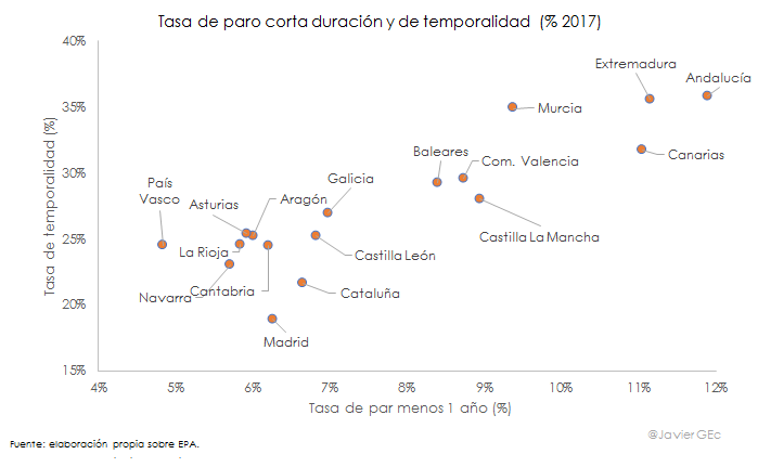 ¿Significa que no hay que atender a las causas y motivos de las diferencias en el paro de menor duración? No, de hecho, existe una correlación entre mayor o menor paro y la proporción de asalariados con un contrato temporal. Entre otros motivos, la diferente estructura económica -mayor proporción de la construcción o de la hostelería, con un alto nivel de temporalidad- determina diferentes tasas de temporalidad entre regiones, que, a su vez, provoca un mayor o menor desempleo de menor duración al tratarse de un colectivo de trabajadores en continua transición del paro al empleo temporal.