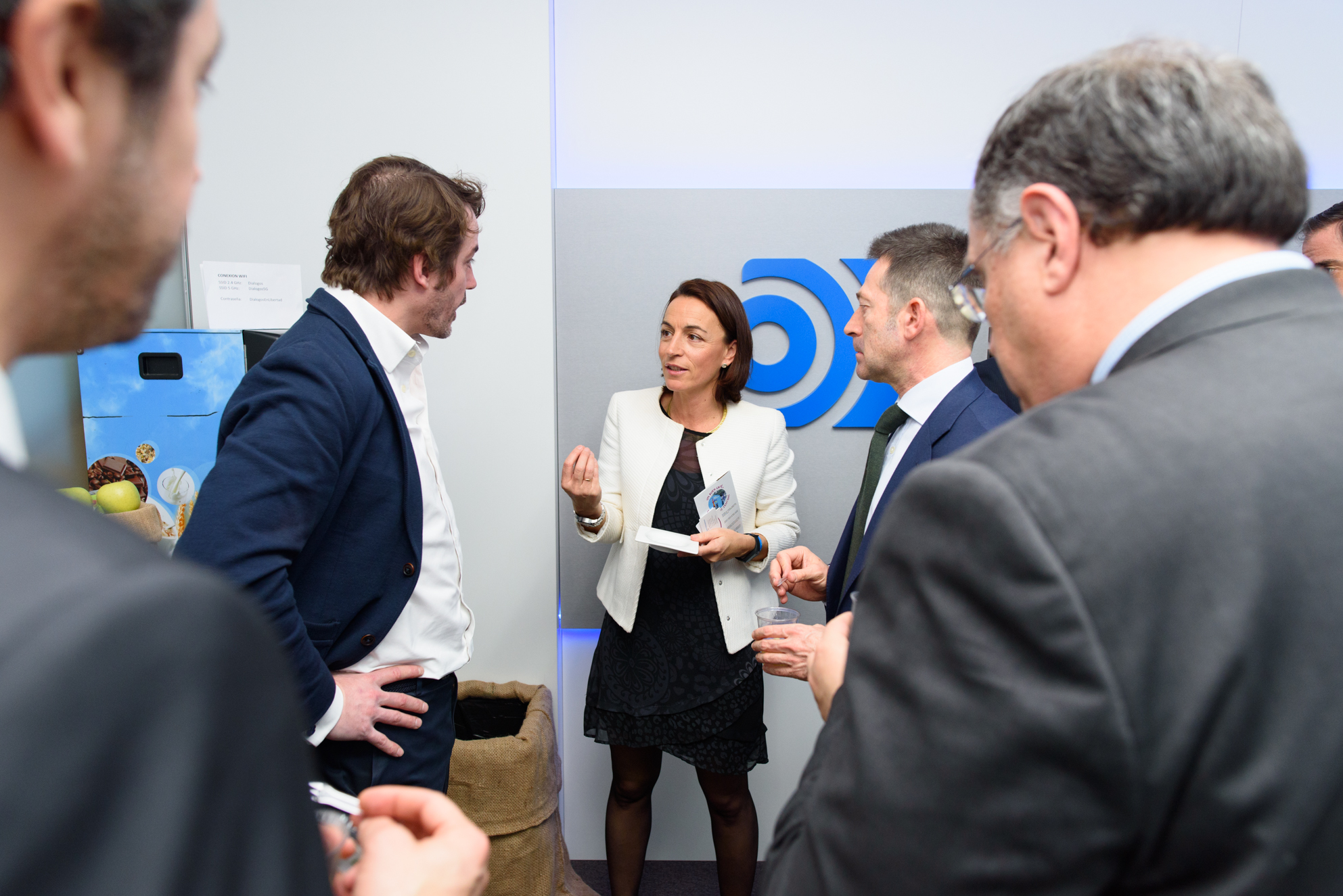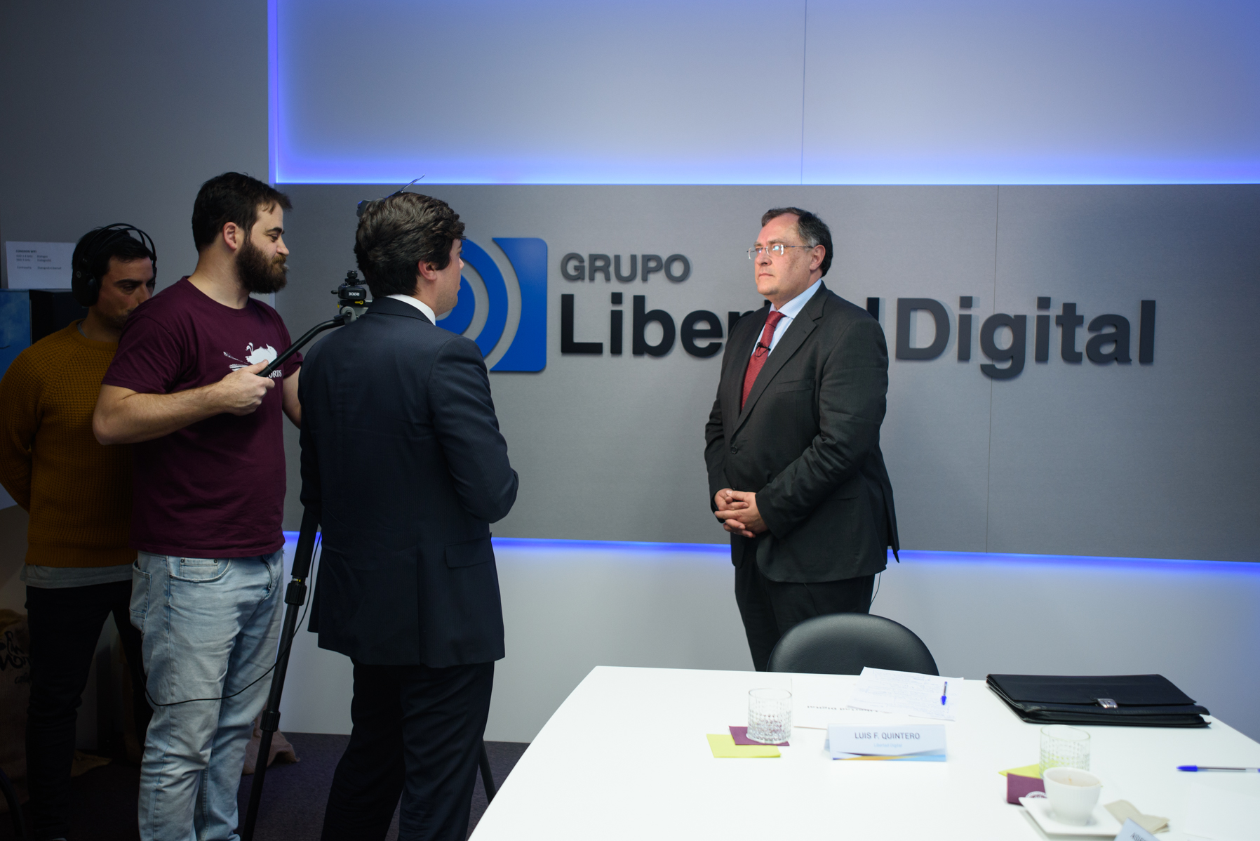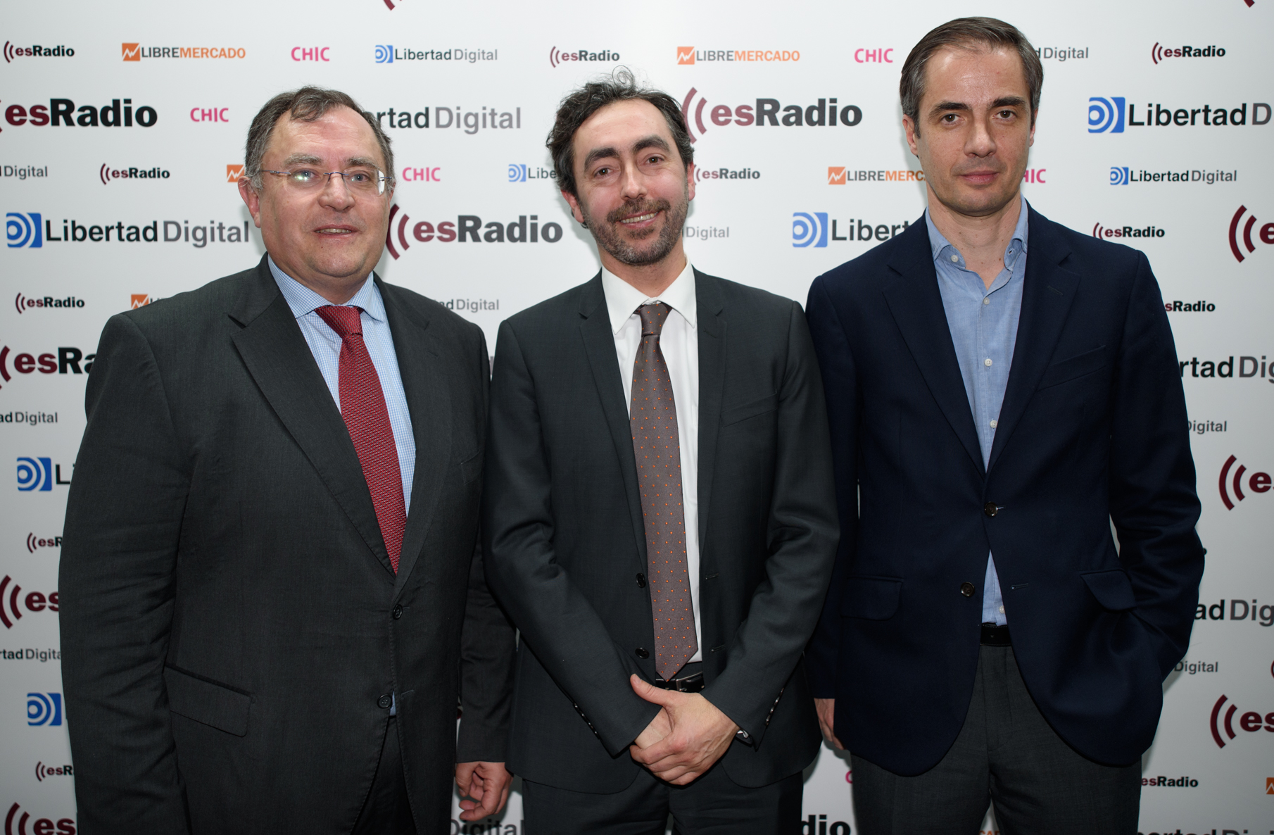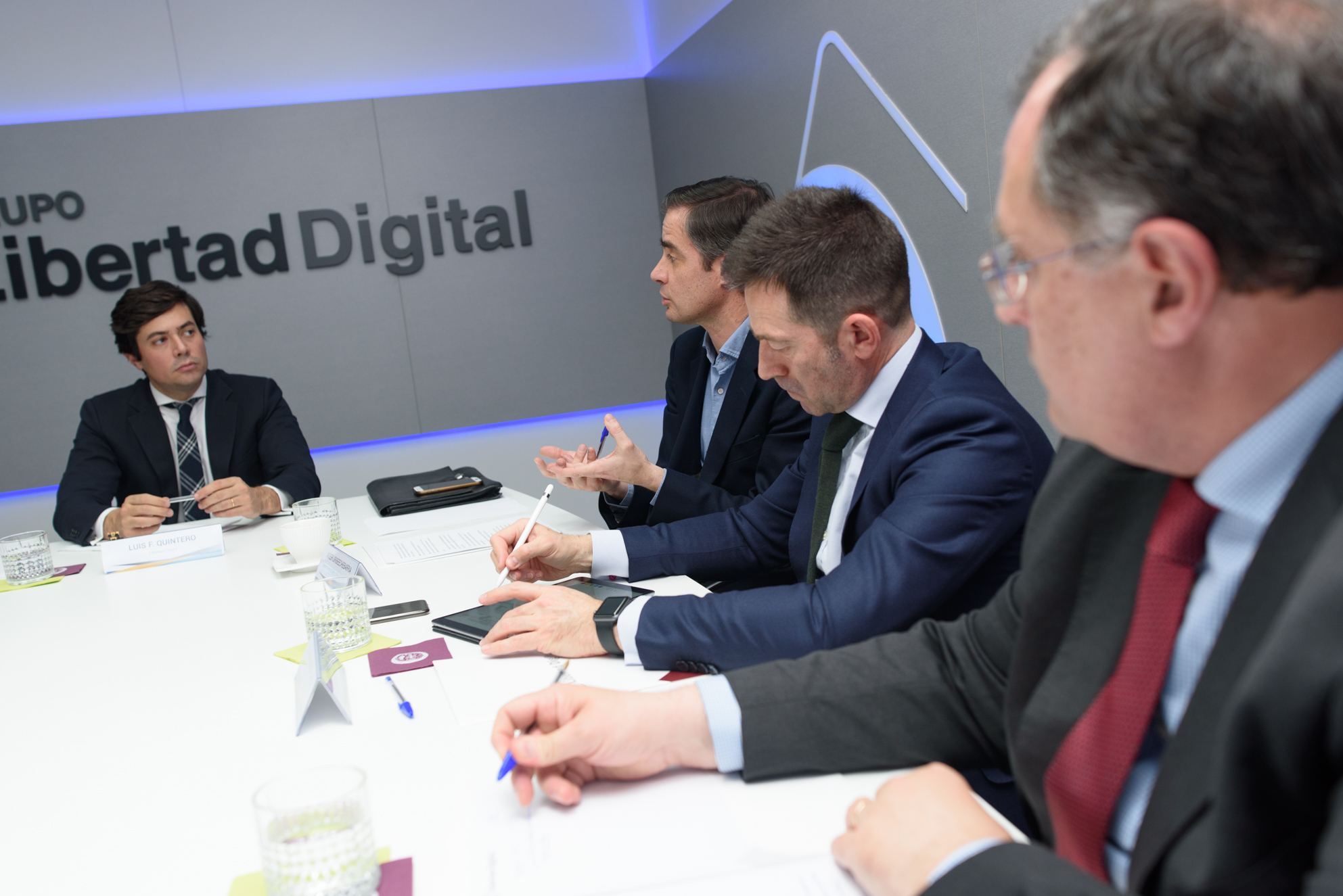 Carlos García Ciriza, de ASEAFI (de espladas), charla con sus compañeros junto a Luis F. Quintero de Libertad Digital y Asier Uribeechebarría de Finanbest, momentos antes de comenzar el coloquio sobre asesoramiento financiero en Diálogos en Libertad.
