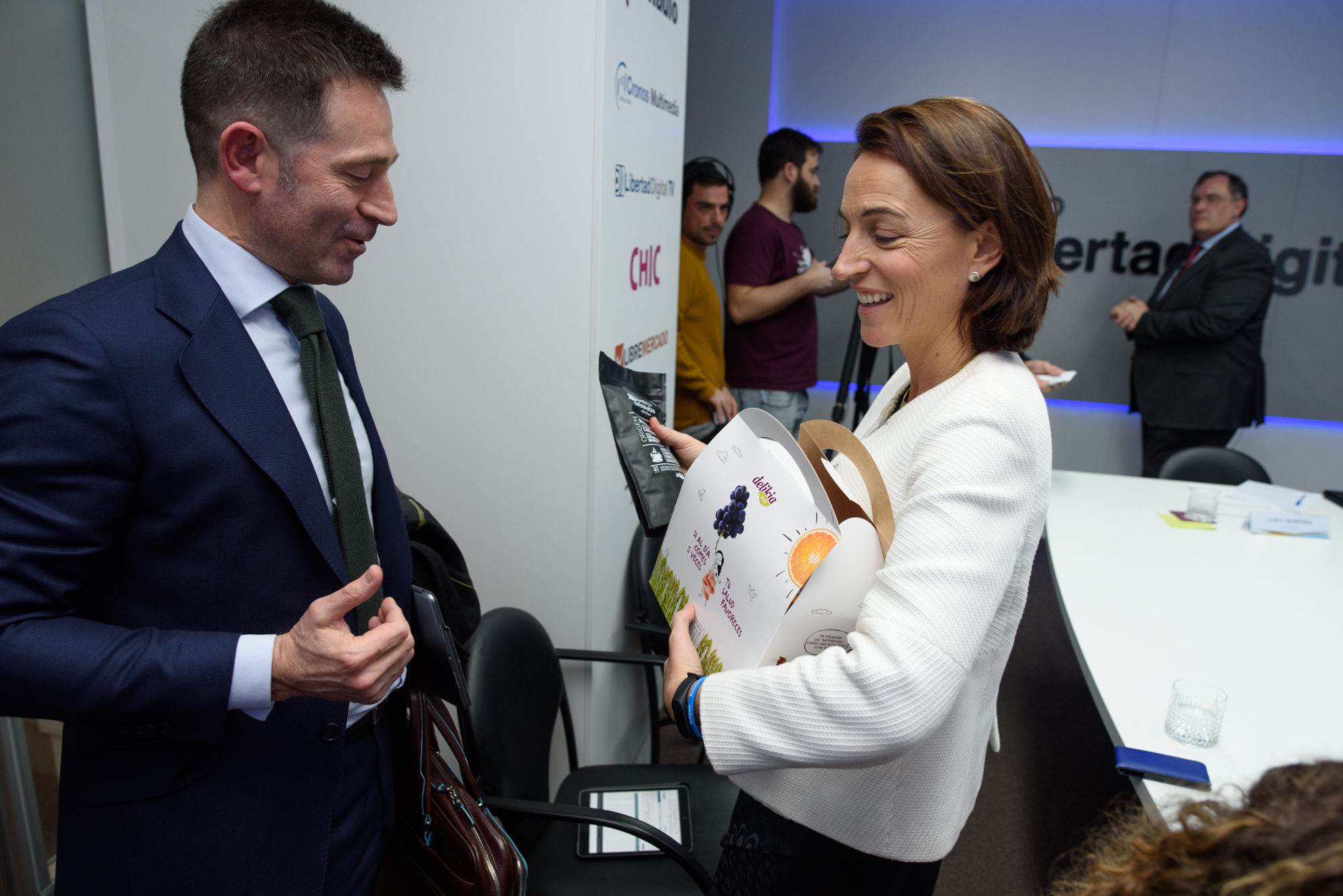 Carlos García Ciriza, presidente de ASEAFI junto a Cristina Cal, directora de Marketing de Delikia Fresh, que ofrece el desayuno en Diálogos en Libertad y obsequia a los participantes con una cesta de alimentos frescos y café.